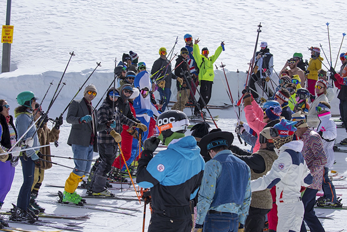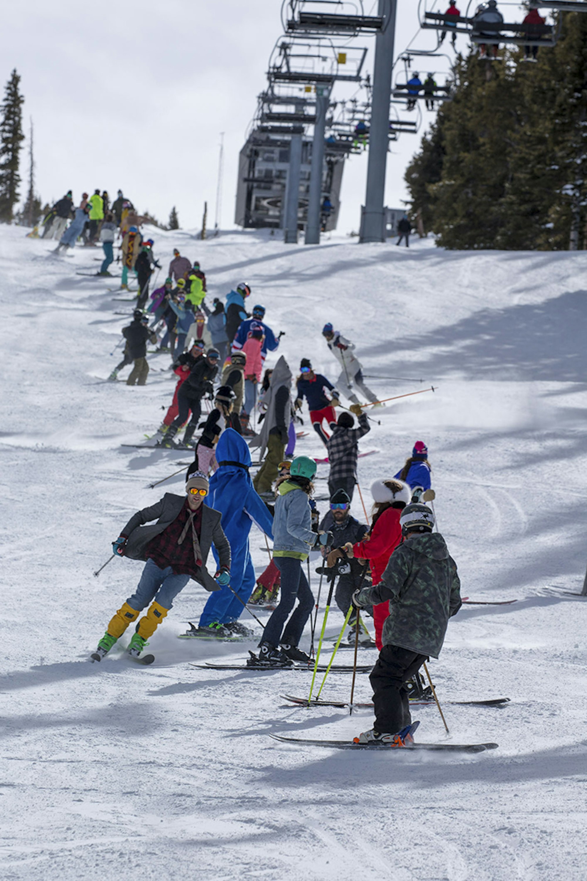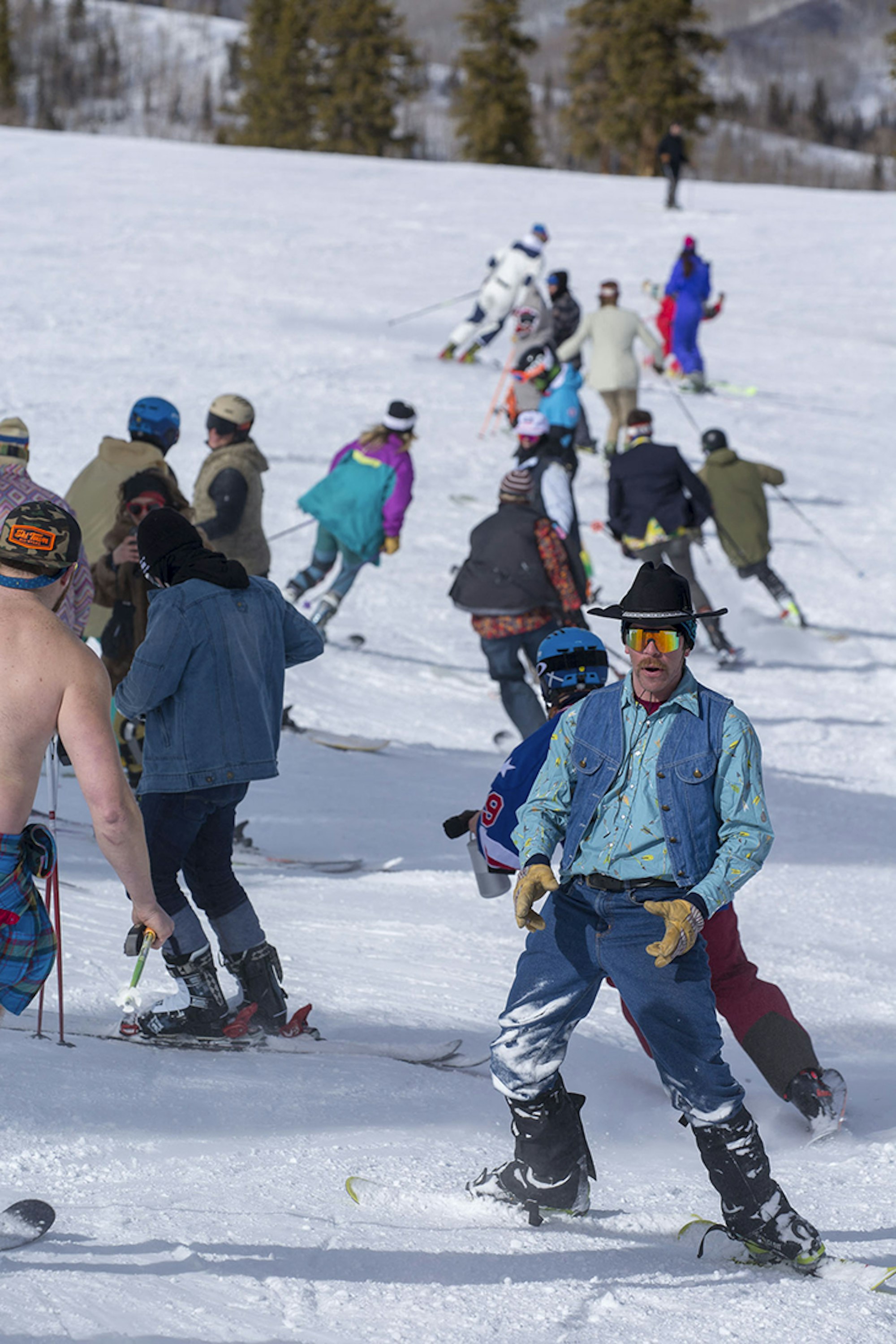 The welcome crew, recruiting ski testers to join the monstrous human slalom on Snowmass. Photo: Matt Power