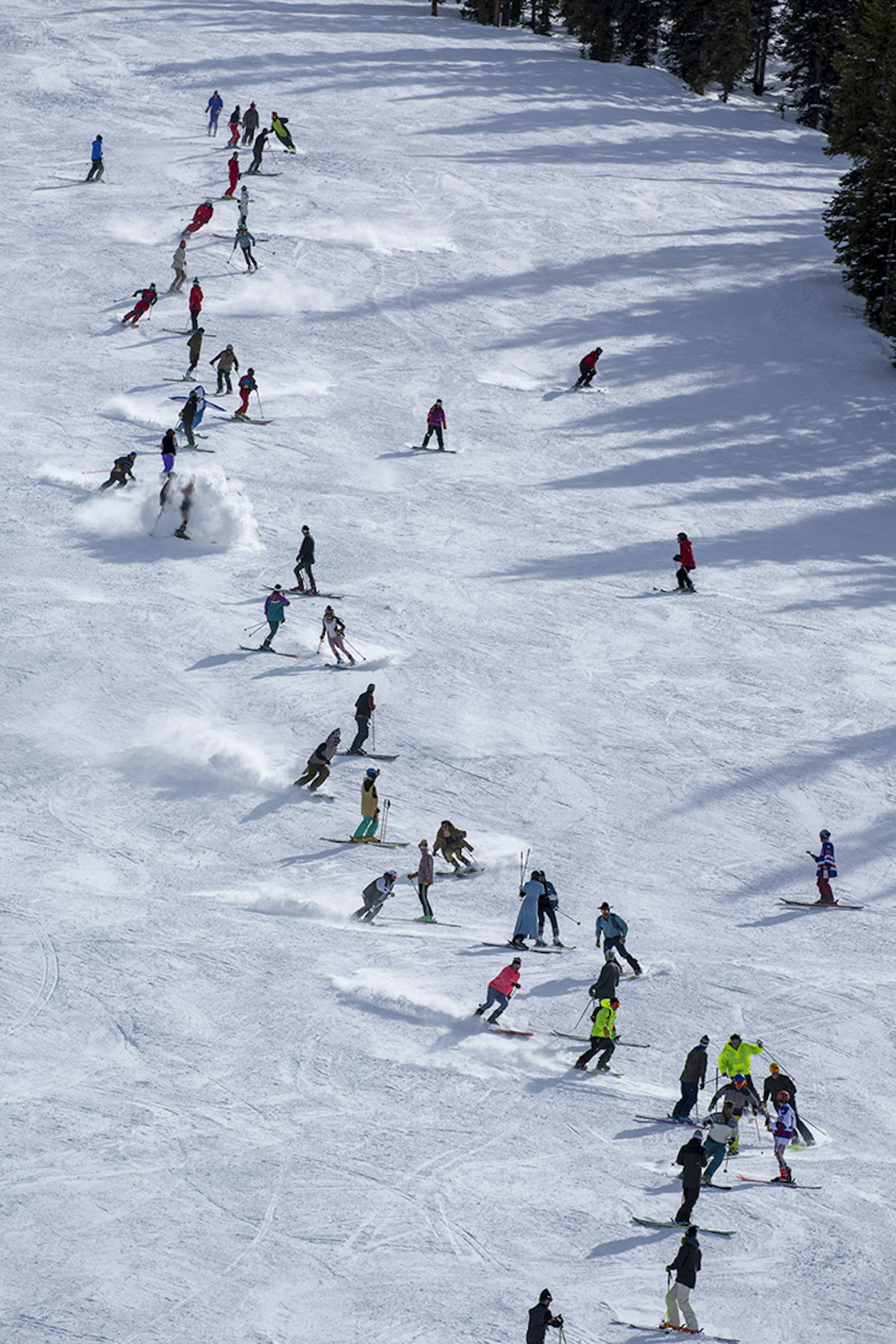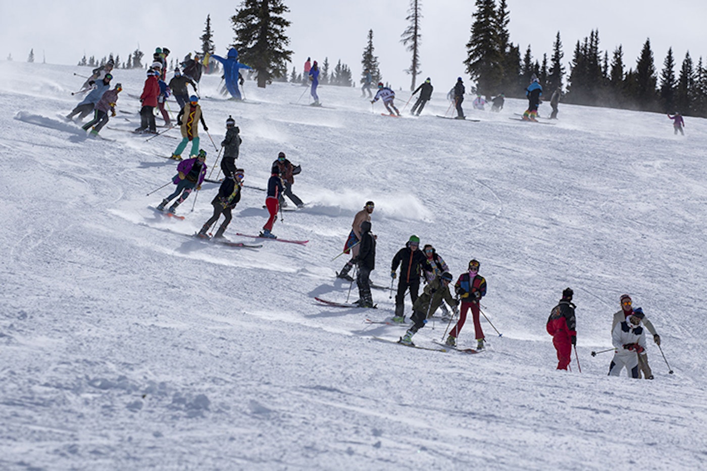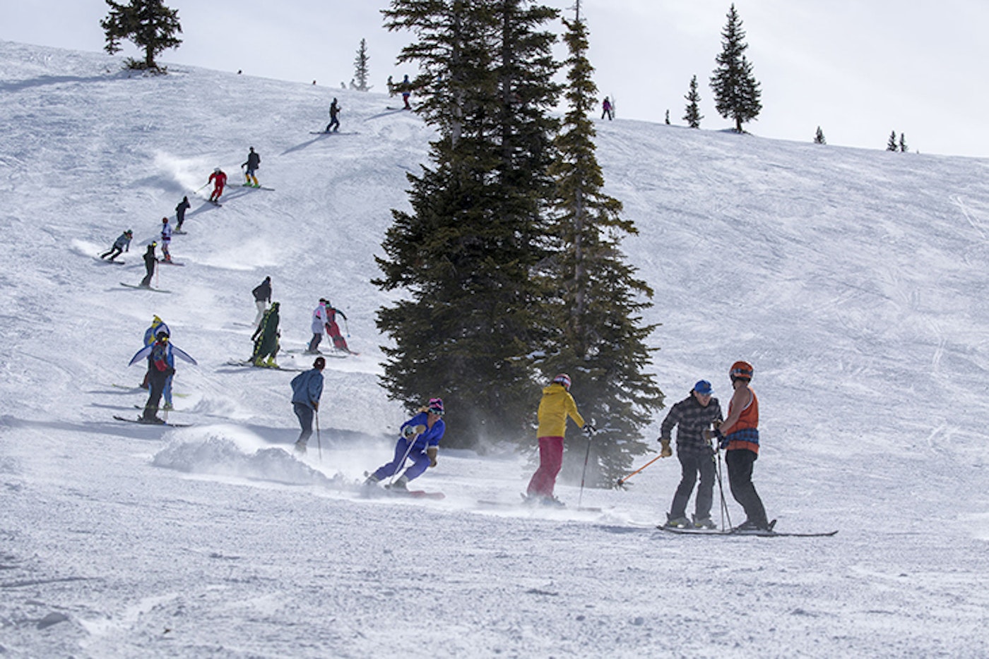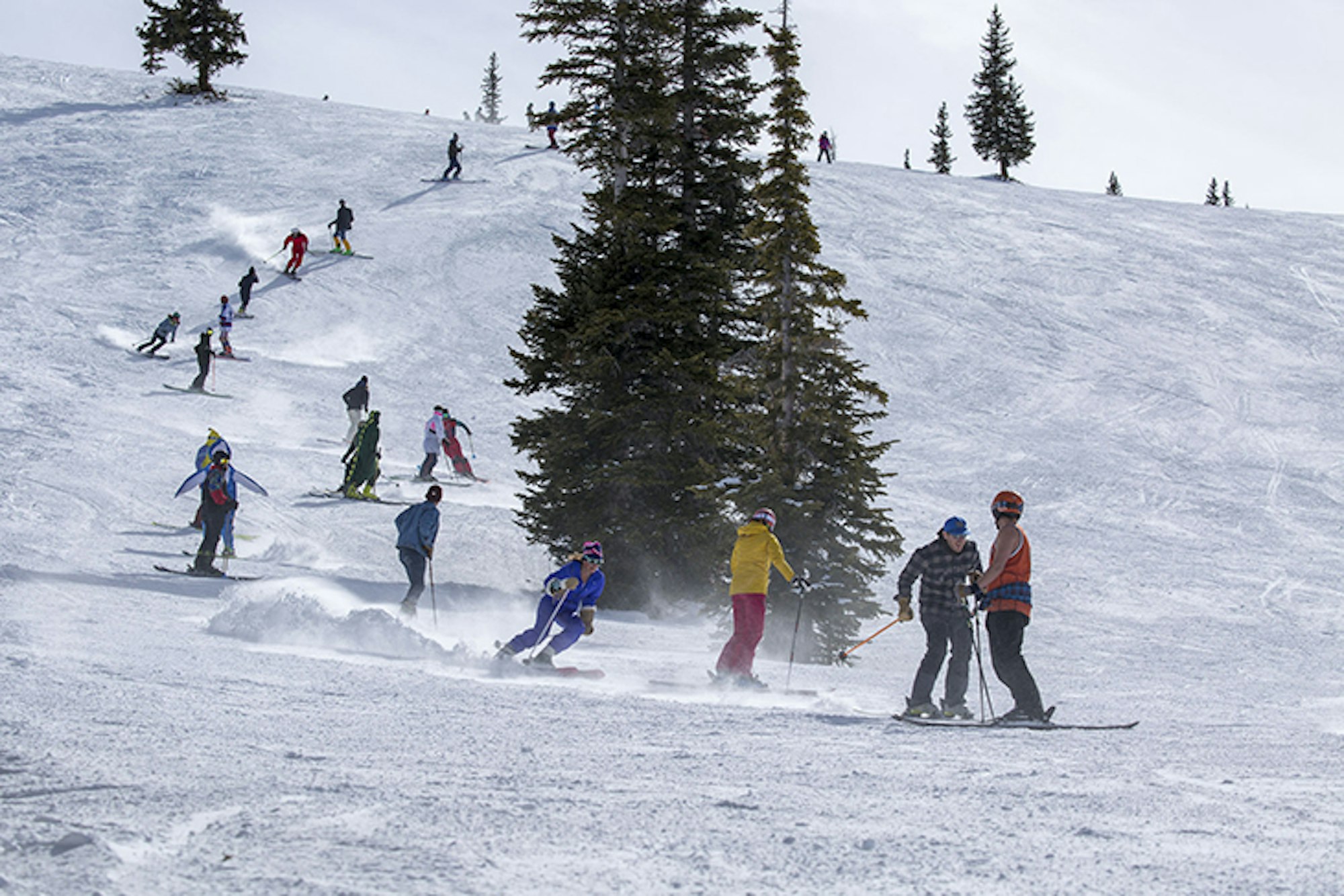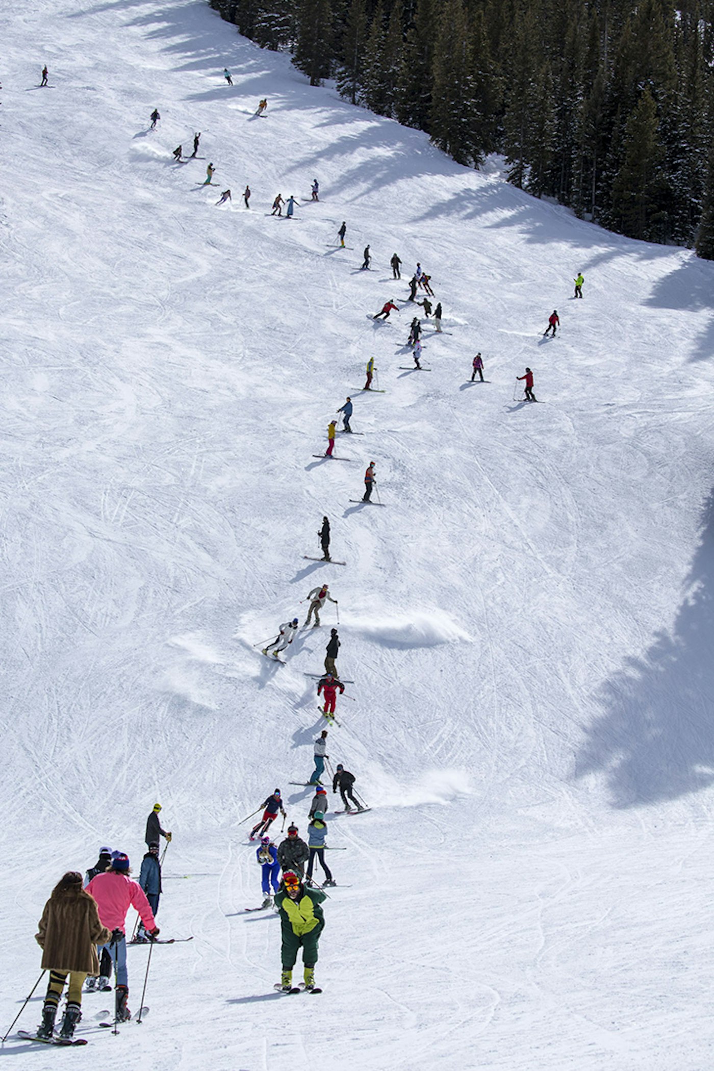 On Monday, we were blessed with over seven inches of fresh, blower Colorado snow, which allowed us to test out the 115+ mm skis—the ones you want on the deep days. As the week has progressed, the temperatures rose a bit, and we’ve been fortunate to have damn perfect conditions for testing 100-114 mm skis, as well as the 85-99 mm skis and park-centric ones, too. Whether it’s been trenching groomers, navigating bumps, hitting cliffs, zooming through the trees, jibbing around in the Snowmass terrain parks or enacting the biggest human slalom in the history of skiing (yeah, we’ll claim that), our army of talented ski testers has been kicking ass and taking names.