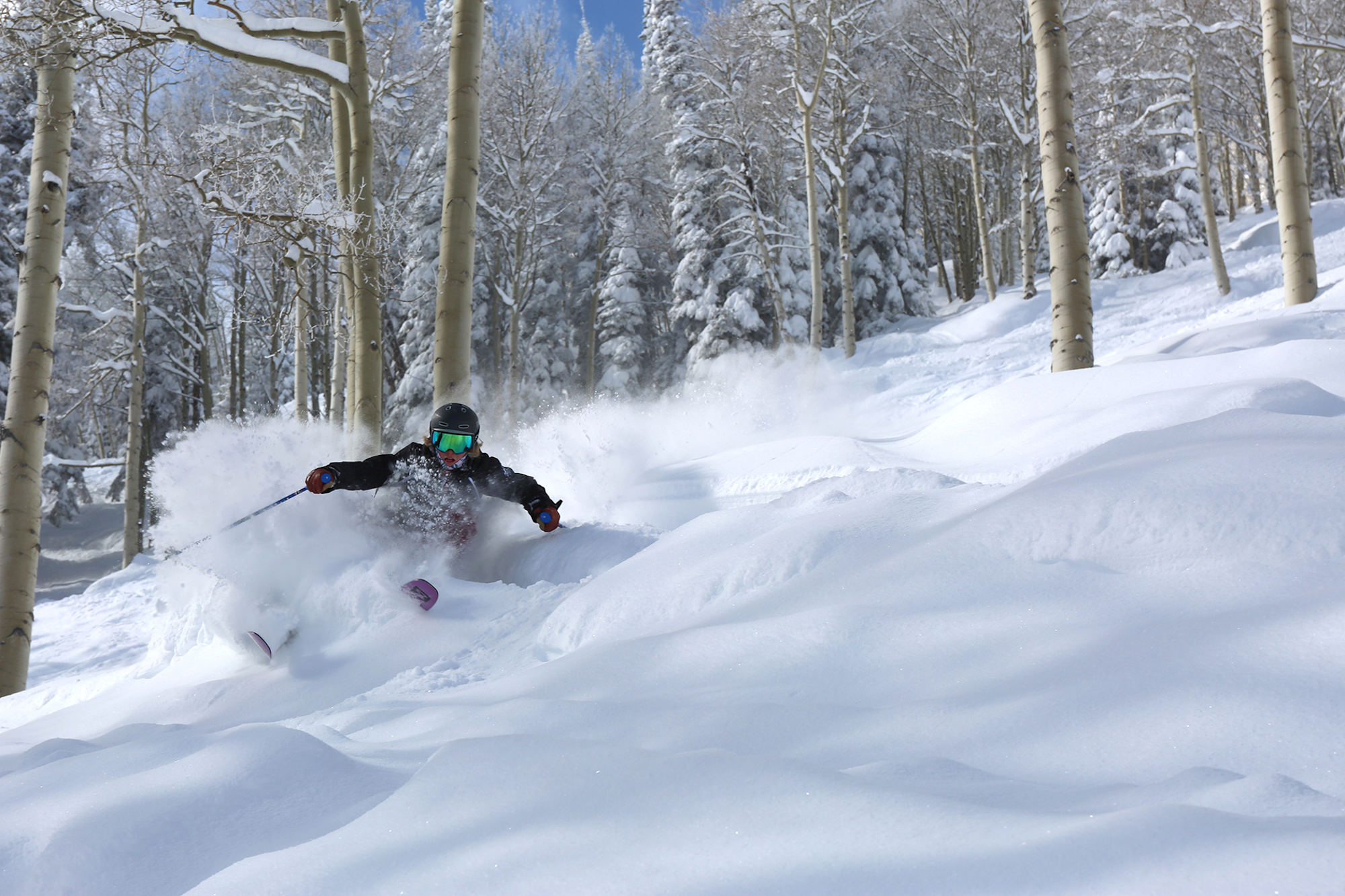 Heading into the Aspen trees to find some fresh. PHOTO: Donny O’Neill