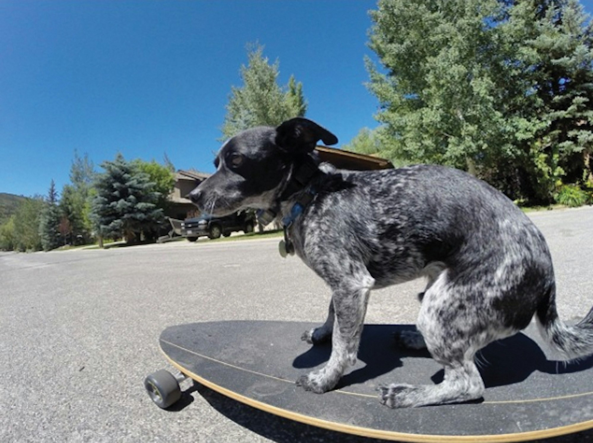 Dex is a different sort of beast, a tail-wagging, walking contradiction. She chooses at random whom she will cuddle up to and at whom she will growl. She will allow a pretentious poodle to trot through her front yard one moment and the next take off after a dopey retriever just going for a walk. Her owner, adventure extraordinaire and professional skier, Rory Bushfield, describes her temperament simply and perfectly: “Dex don’t give a f#ck!” Example: She loves to make jerky, sudden movements while towing Rory on a skateboard. Dex then howls with delight when she sends Rory flying off his board and into a tomahawk on the pavement.