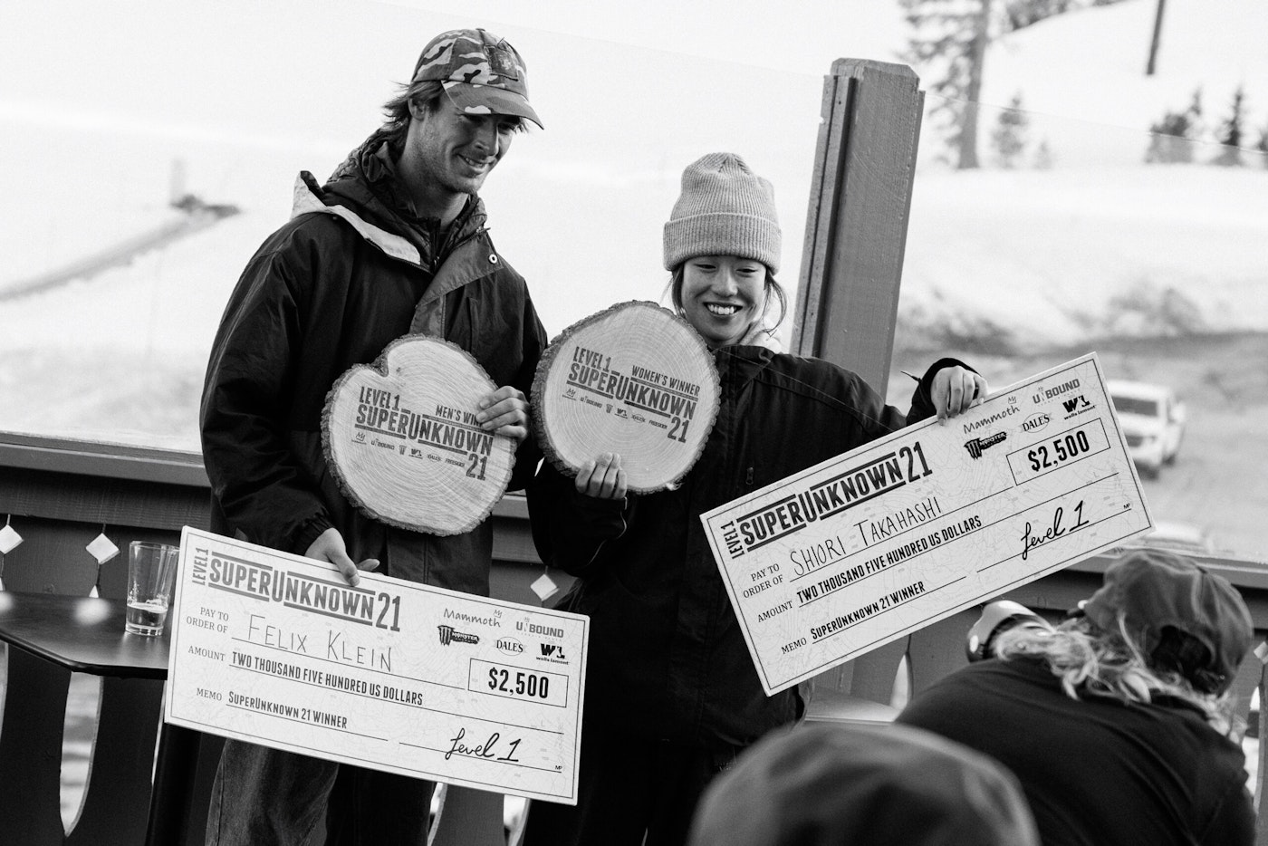 SuperUnknown 21 champs Felix Klien (left) and Shiori Takahashi (right) pose with their hardware as they receive a resounding ovation from the crew.