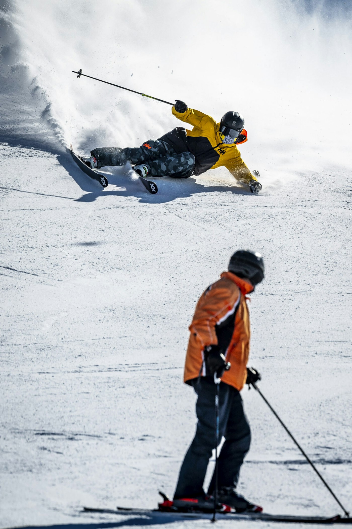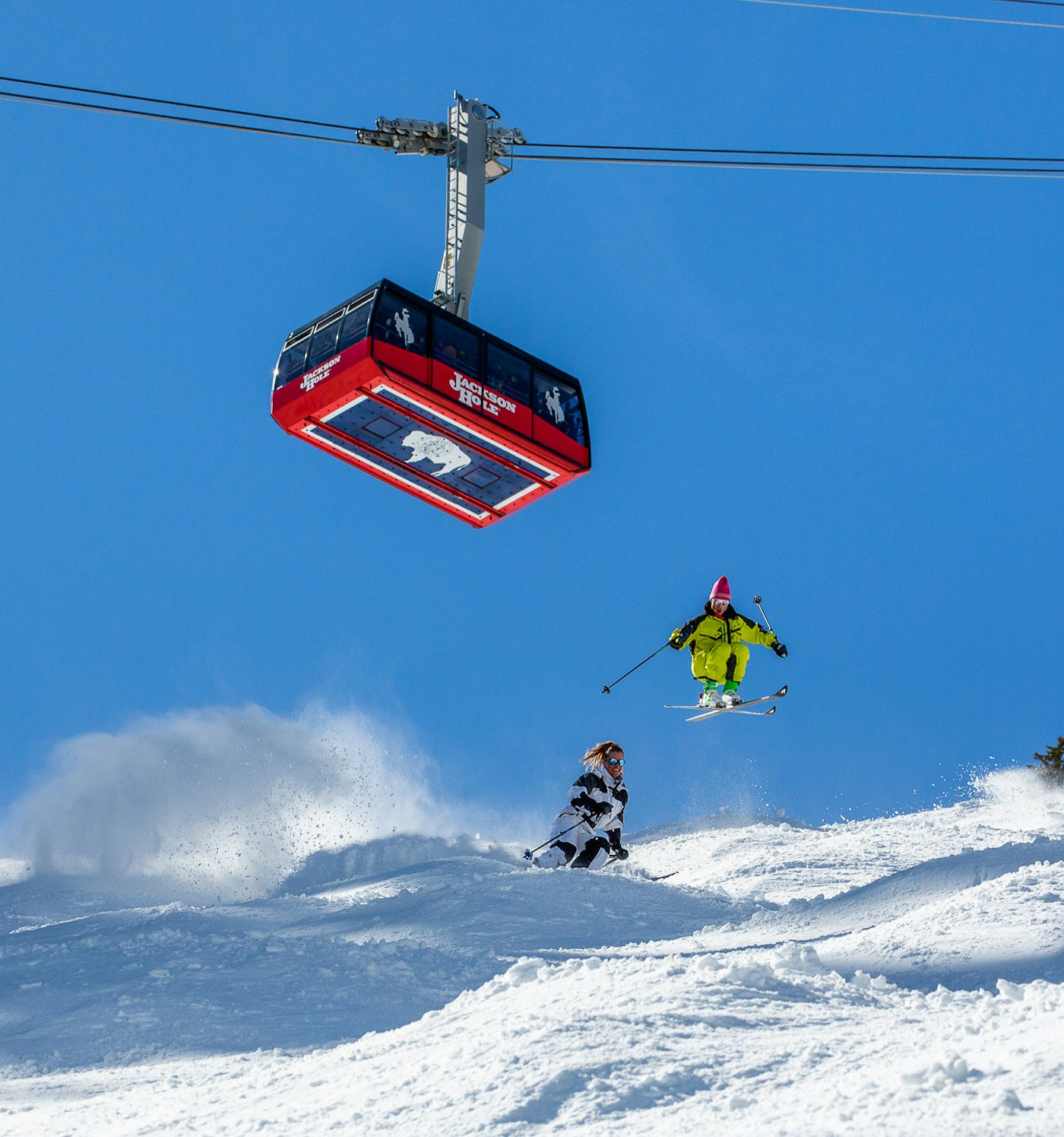 Jim Ryan [right] is one of the finest skiers at JHMR and a big proponent of neon green-clad, straight ski mogul bashing. | PHOTO: Eric Seymour