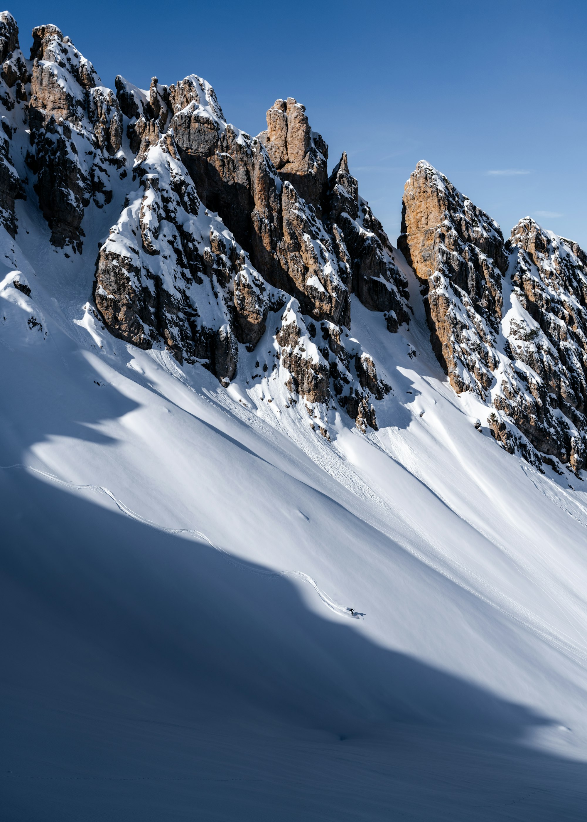 The following day was devoted to the Val di Mezdì, a classic off-piste run that stretches to the north of Pordoi Pass and gets likened to the Vallée Blanche in the Alps, even though it’s not a glacier run. The 7.5-mile route boasts a vertical descent of more than 4,500 feet that unfurls along a stunning valley sandwiched by more colossal rock walls—a theme here in the Dolomites. We raced down, carving fresh tracks in the snow, and only slowed when we reached the final narrow, steep pitch that spit us onto the slopes of Corvara ski area.