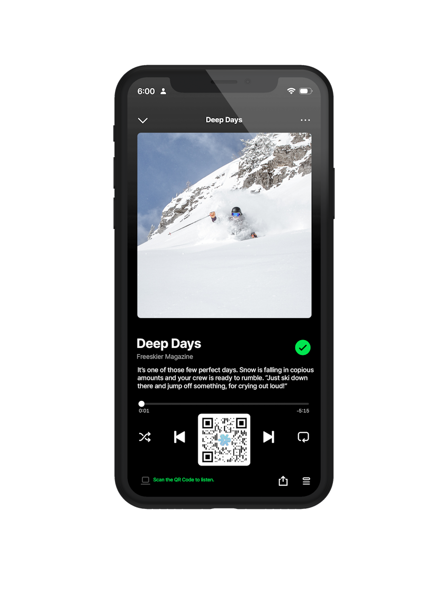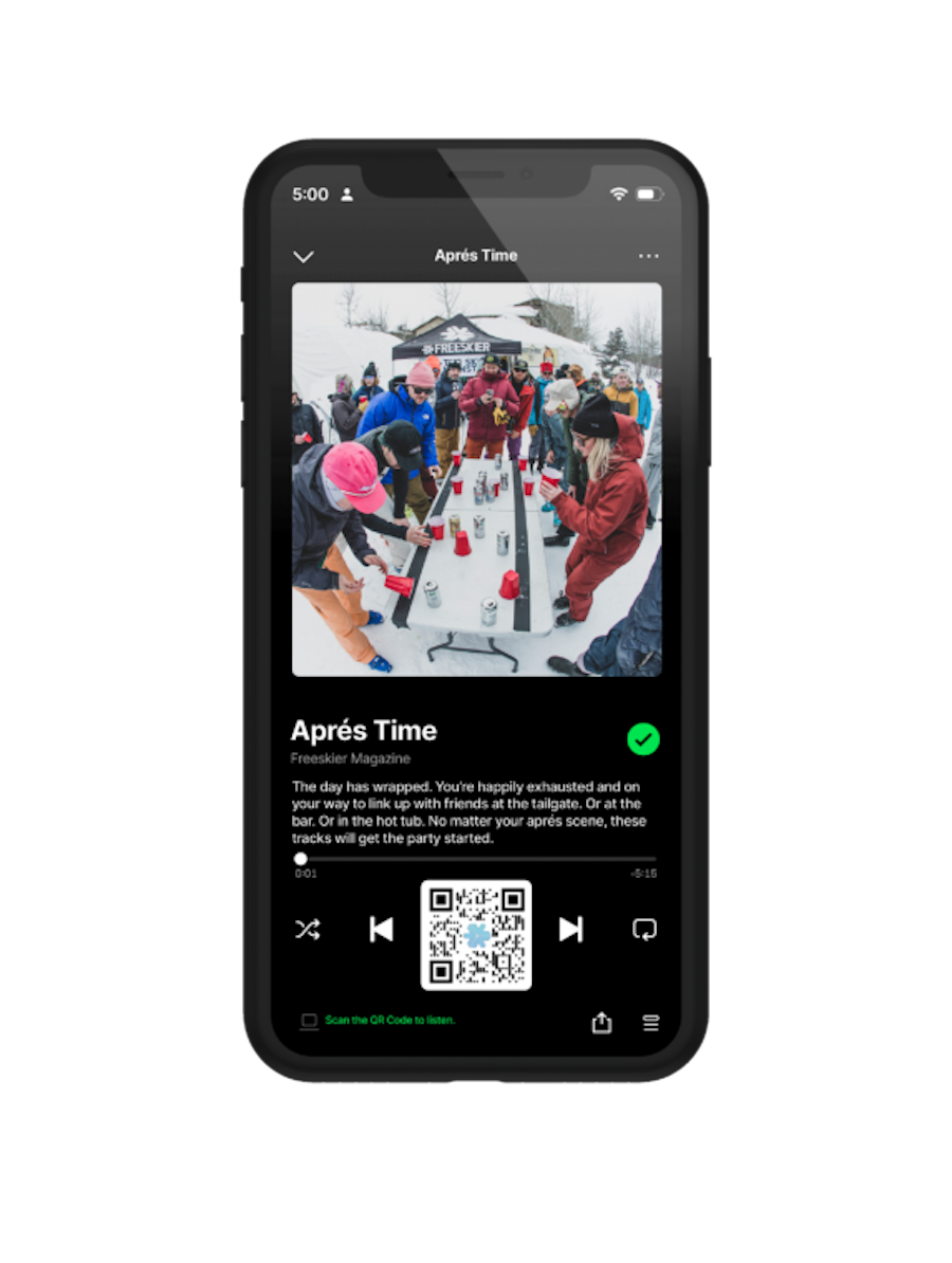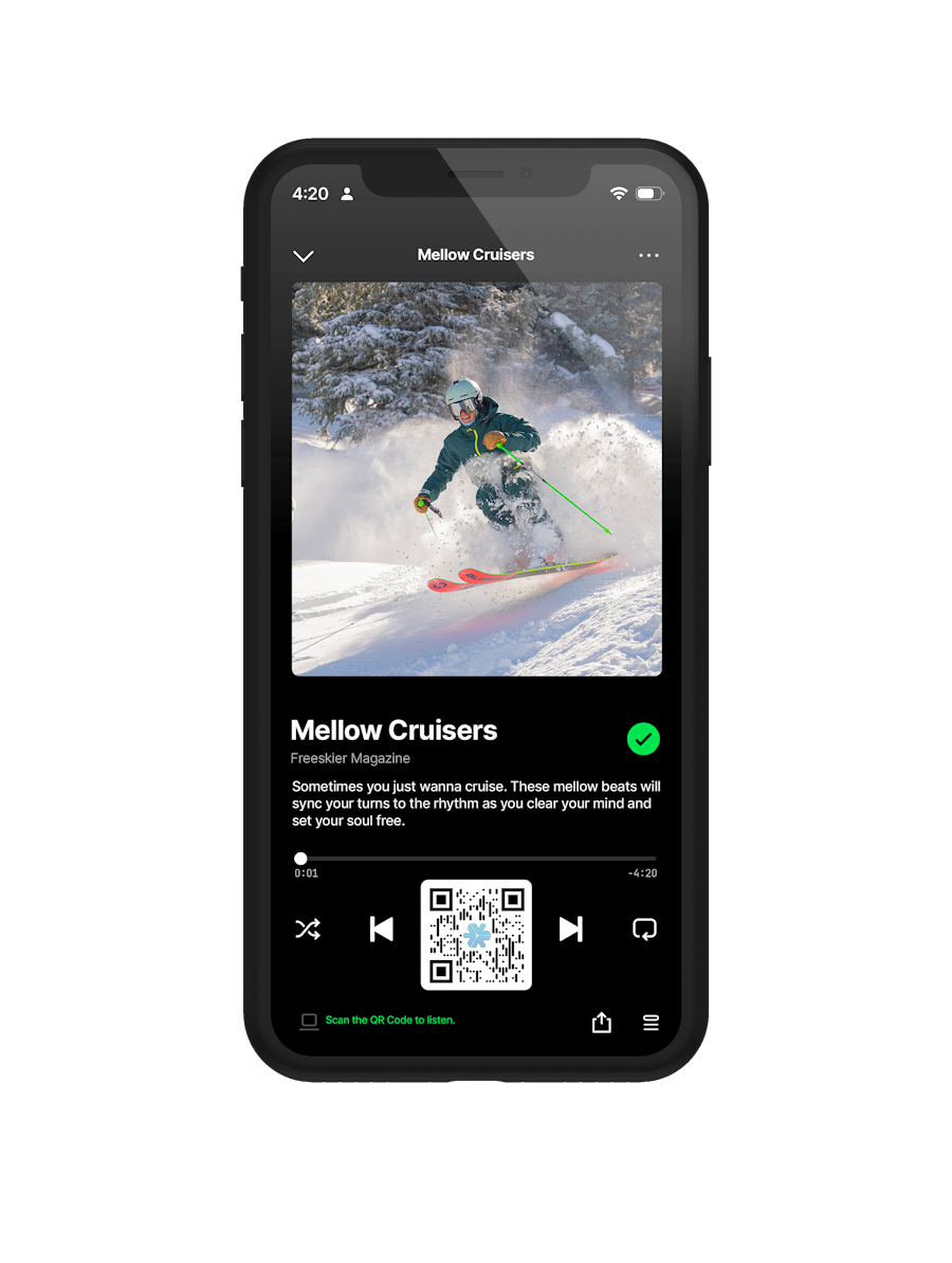 Through the years, FREESKIER has hosted concerts that bring music to the mountains and now we’re delivering it straight to your Spotify account. Our editors have curated four tasty playlists for your listening pleasure. Whether you’re a laid-back cruiser or someone who’s in it for the white-knuckle excitement, we’ve got you covered.Toss in your earbuds, or fire up the speaker, and scan these QR codes (listed below) to see what we’re listineng to. Be sure to stay tuned throughout the winter, as we’ll be slinging curated selections each month.