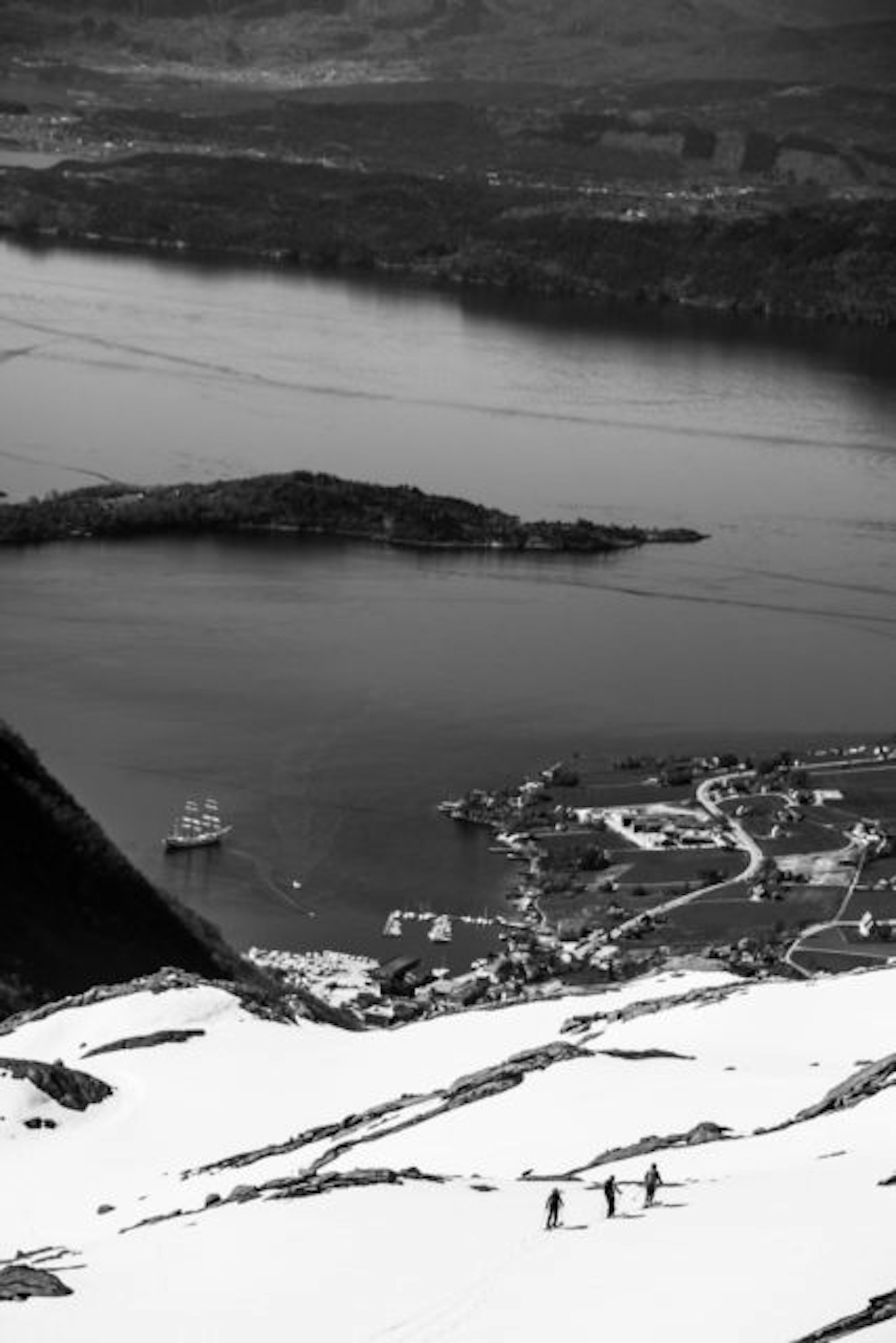 Joining the crew was Wille Lindberg, a former Freeride World Tour competitor, who guided these adventurous skiers to low-angle terrain near his home in Jondal, around the Folgefonna glacier for some gnarlier lines and, finally, on a ski tour up one of the countless mountains shooting out from the sea just outside the final stop, Rosendal.
