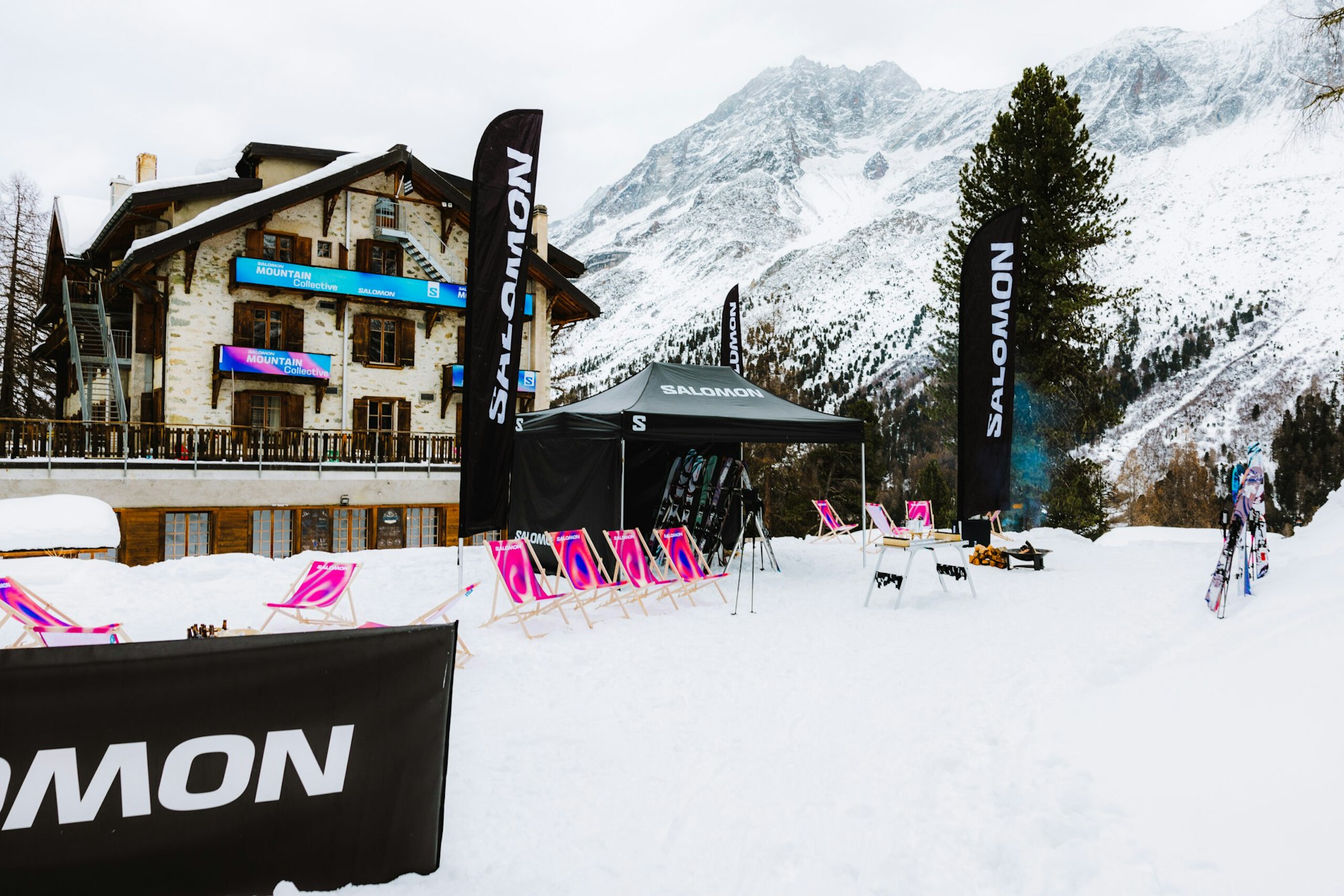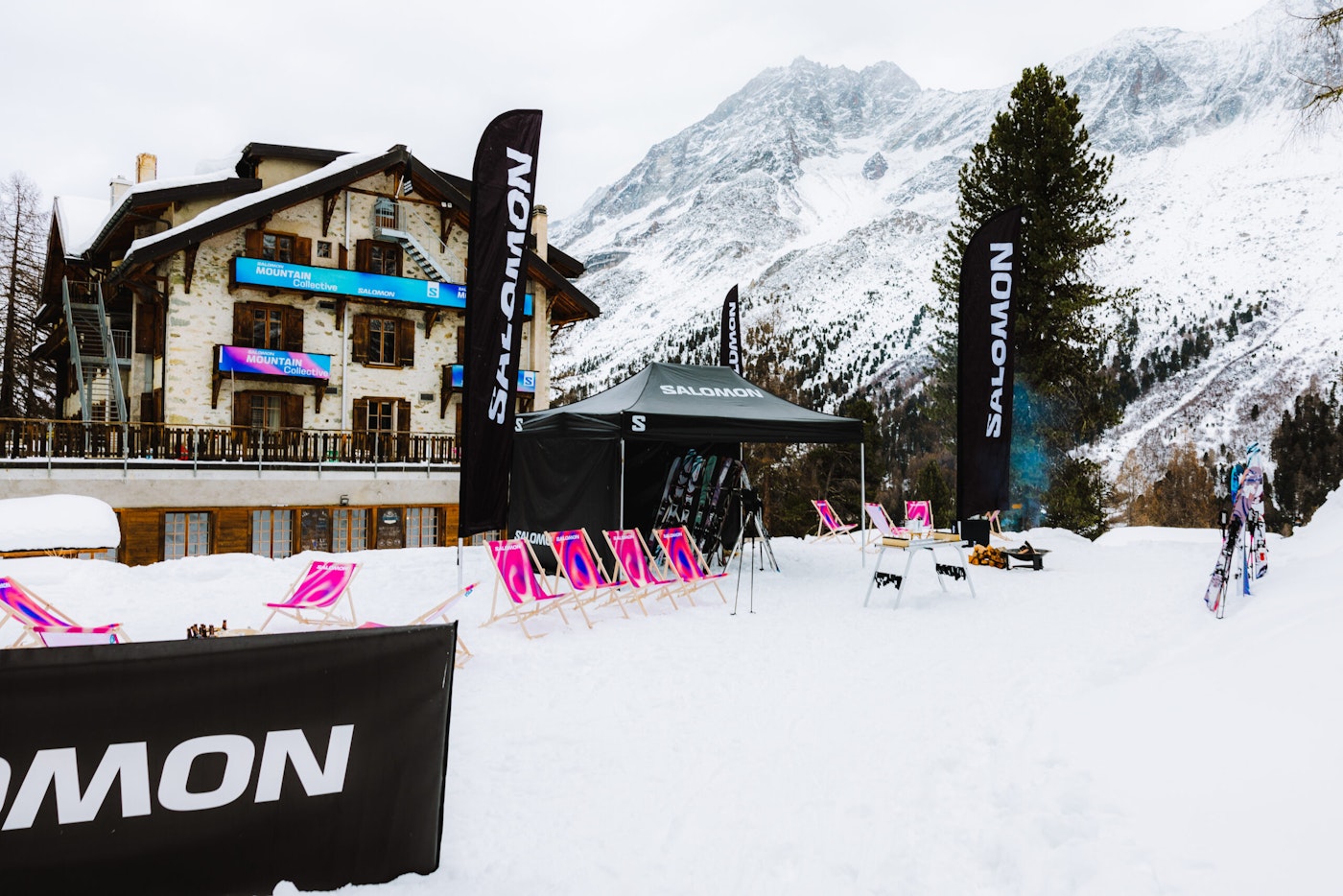 Early the next morning, the crew loaded up the van and headed over the border to the small Swiss ski area of Arolla. Situated on the famous Haute Route, this charming ski hill is surrounded by stunning mountains and bordered by a glacier that looked as if like it was feeding deep blue ice onto one of the resort’s groomers. Arolla—and a three-story chalet—would be the home-away-from-home for Salomon’s Mountain Collective—an annual congregation of Salomon’s alpine employees, athletes and media to test skis, discuss the industry and break down the new vision of the QST Collection.