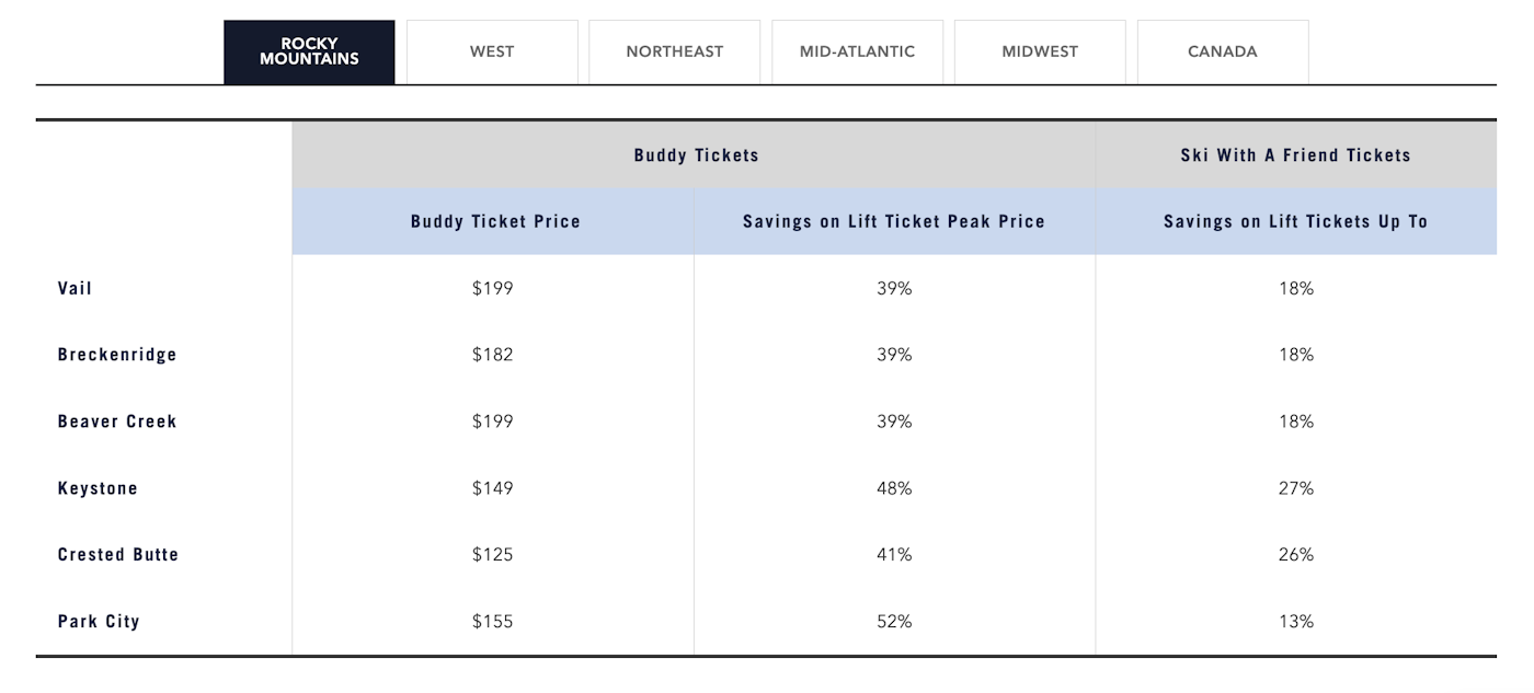 For a limited time this spring, every season pass purchased will include 10 Buddy Tickets, which offers up to 45% in individual lift ticket savings for friends and family all season long. Additional incentives with select Epic Pass purchases include up to six Ski With A Friend Tickets, which offer a discounted price on tickets purchased at the ticket window at select resorts.
