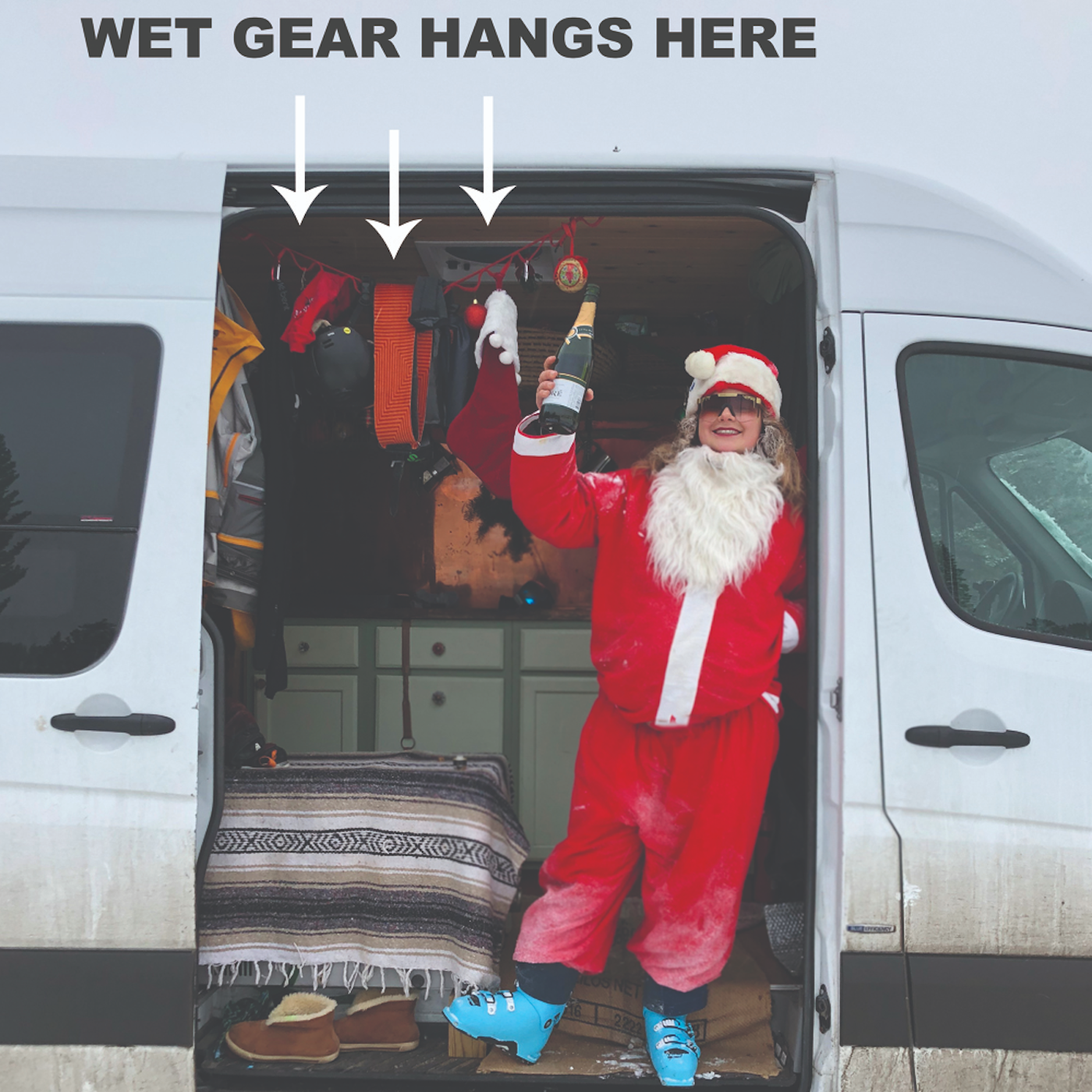 Easier said than done, right? Us skier folk can talk about the hottest/coldest/driest/trendiest gear all day long, but even with next year’s 1000L Gore-Tex tri-zip technology, your gear will eventually lose its waterproofing integrity. Let’s be honest, if you’re living out of your van odds are you don’t have the latest and greatest gear anyways. Once I return back home after a day of skiing pow, I immediately hang my wet gear from a daisy chain that is rigged up across my sliding side door. My heater is installed under the passenger seat, so that it cranks air up towards my wet gear when I turn it on. (Don’t forget to pull the footbeds from your liners and the liners from your boots and hang those, too!) If my boot liners and mittens are still soaked in the morning, I resort to the ol’ gear-in-dashboard trick with defrosters blasting heat while driving to the mountain. Also a great place to heat up your breakfast burrito when you are in a pinch for time.
