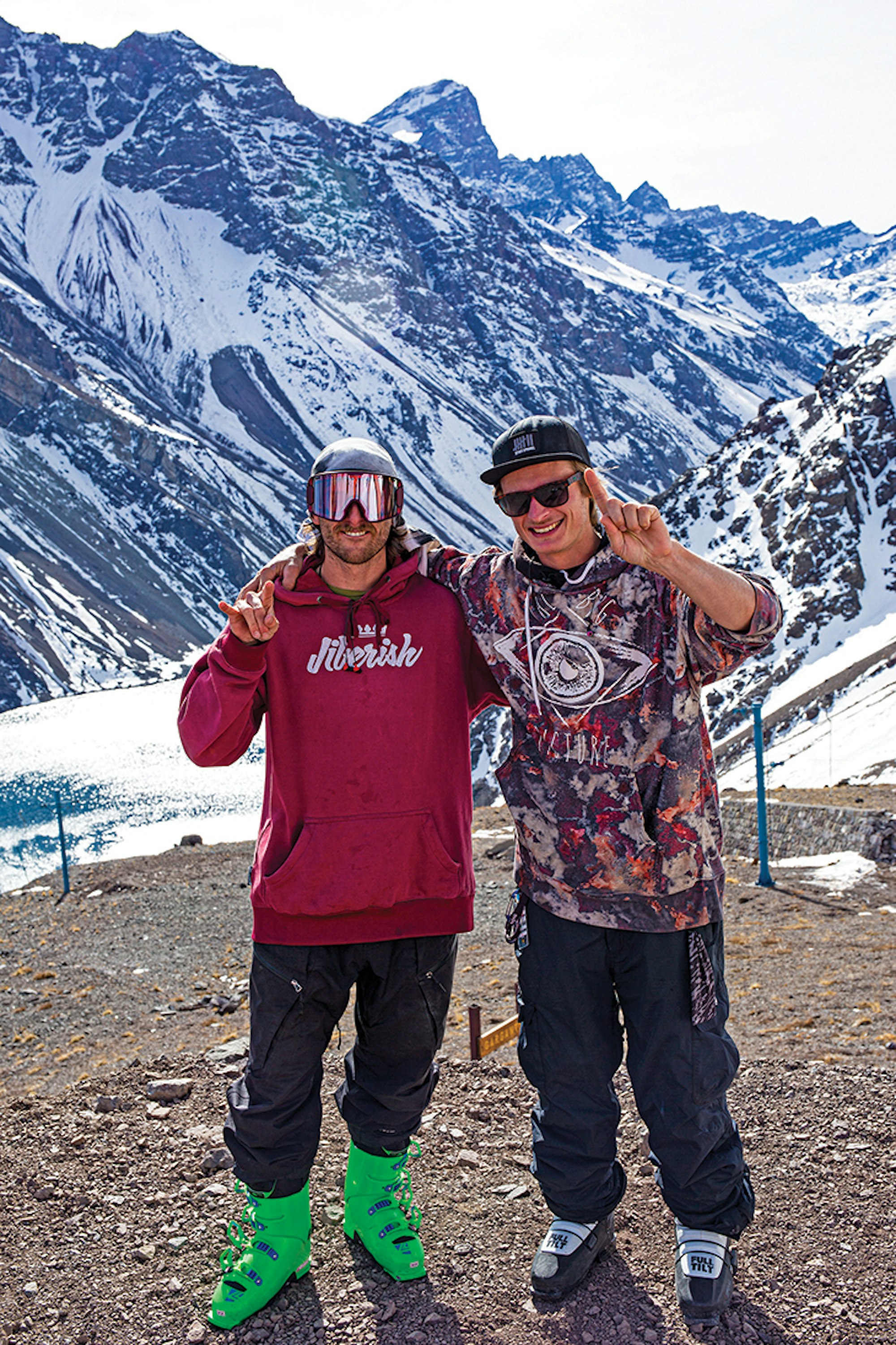 Over four days, we packed in as much skiing as we could under the August sun. We hoofed it off-piste to the top of the Lake Run, where we enjoyed wind-deposited snow pockets sheltered by steep crags down 1,000-plus-vertical feet to the lakeshore. We took advantage of the innumerable side hits spread across the Las Lomas trail and even built a kicker on David’s Run. For hours Damian, Brian and Tyler launched off the jump under pristine blue skies, reaching into their bag of tricks in front of the crystalline blue waters of Laguna Del Inca while I snapped away with the camera. Our contest winners were right at home lapping the booter. Sporting a do-rag and Chicago Bulls jersey, Brian spun 360 tail grabs until he was dizzy, which aligned with his confident, outgoing and competitive attitude. On the other hand, Tyler’s low-key personality was reflected in his ski style, as he focused almost solely on sending zero spins, grabbing blunt along the way. Regardless of the subtleties of their personal styles, we were over the moon to be sharing this trip with two gents who held skiing in such high regard and had the skills to back up their sweepstakes win.