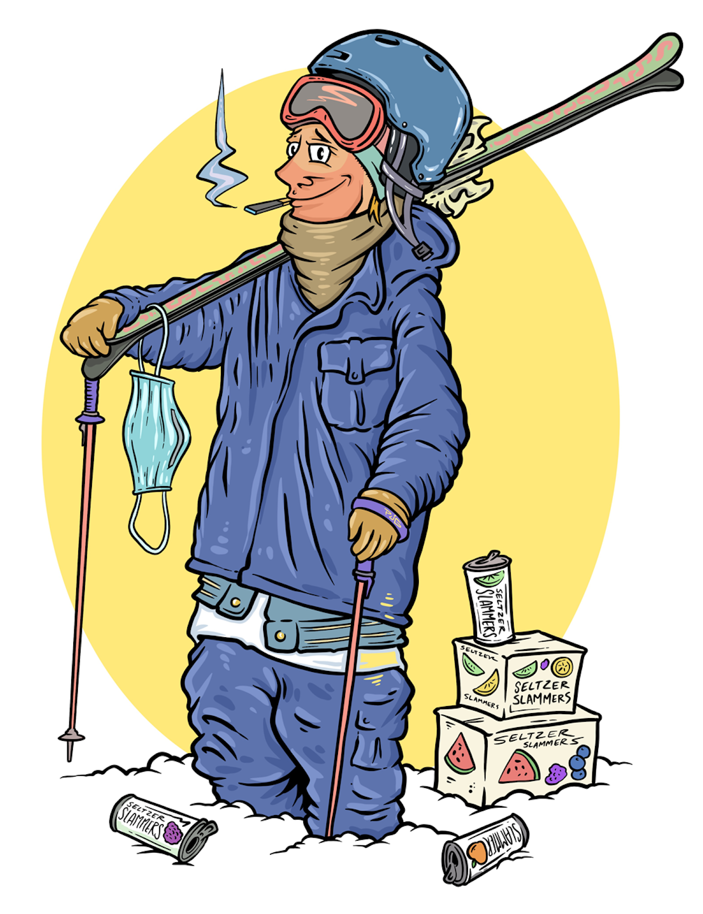 Aside from copping Juul pods and checking to see if mom and dad have Venmo’d their monthly allowance, there’s not much this skier is concerned with. Well, other than stackin’ footy with the boys and dranking ‘til the break of dawn. Sure, they’ve heard about the pandemic but it’s like, chill or whatever. They’ll wear a mask, but typically it’ll hang off one ear or look like a chinstrap because crushing hard seltzers is lit, bruh. Beanie sags, tall tees and Saga everything is the uniform for this skier. Not much of a personality but who needs that when you have abs and ab workouts to talk about. Just swipe right and keep on keepin’ on.