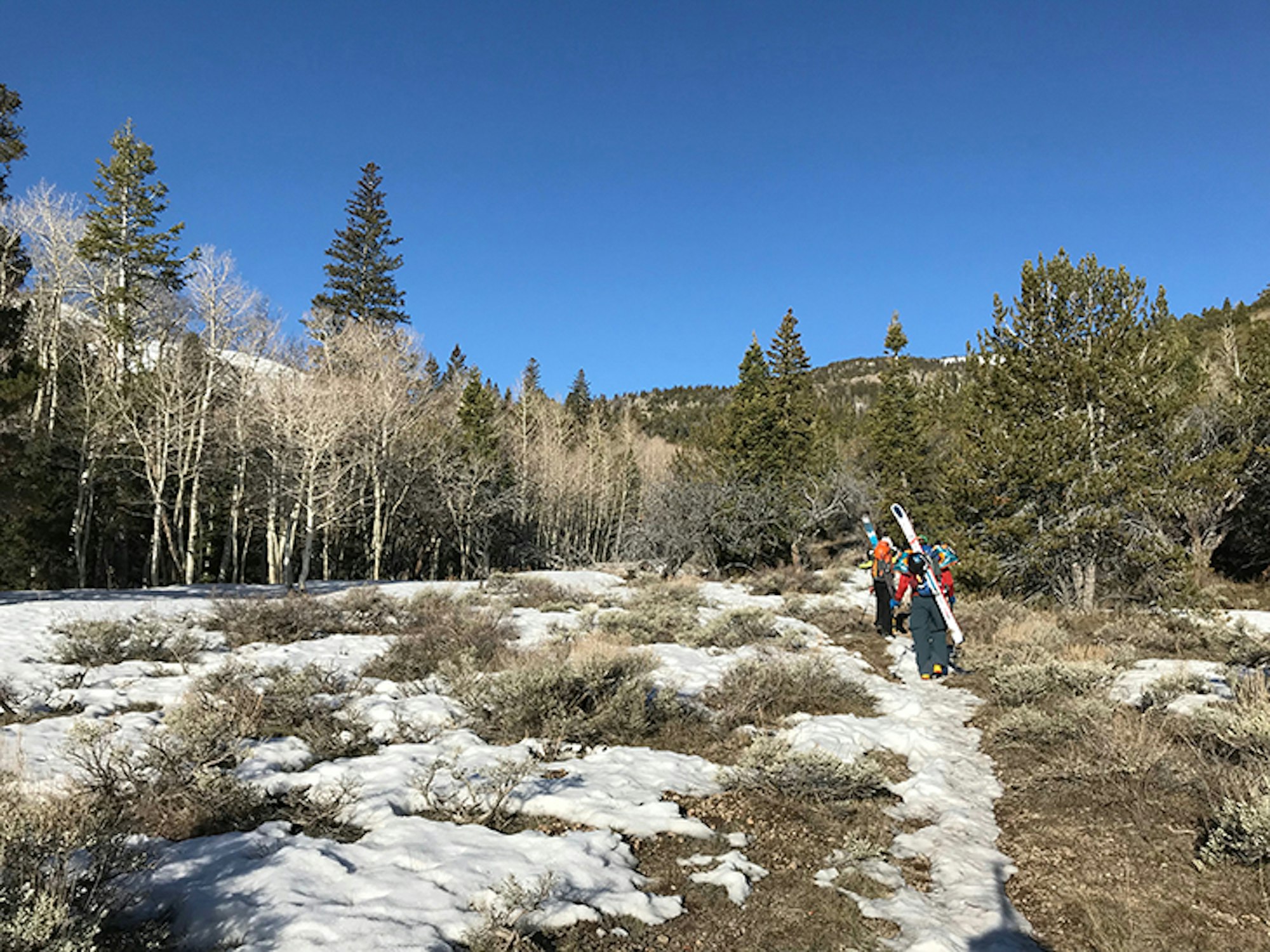 The desert heat slowly creeped up the contour lines, and while we milked every inch of snow on the descent, we finally had to succumb to the mud, shoulder our skis and finish the trudge back to the campground. Not much was said on those final, muggy miles, but the vibe was high. We were still buzzing from the enchanting surroundings that our shared love of skiing just slid us through. The temperature peaked around 70 degrees during our hike out, we were all out of water, dehydrated and surely ready to be done, but no one complained.