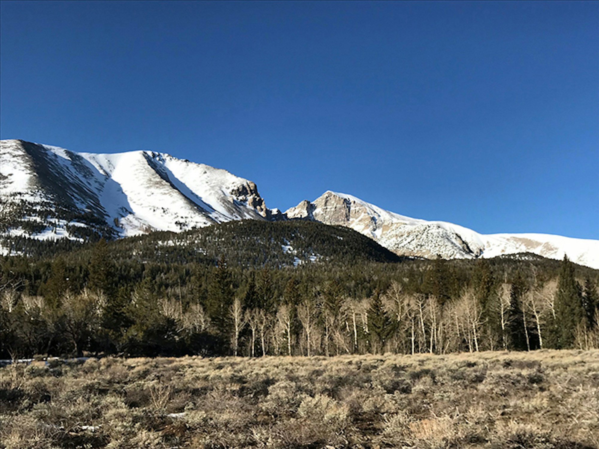 We arrived at the Upper Lehman Creek Campground around 7 p.m., the evening before our ski attempt of Wheeler Peak. Much to my surprise—since I did zero research about winter closures and such—this was our starting elevation at 7,752 feet. The forecast for our adventure was looking bleak. The NOAA point forecast for the summit was calling for temperatures as high as 60 degrees Fahrenheit and winds with gusts as high as 55 miles per hour. After an ultra-long drive and getting strong-armed by the winter closure, it was safe to safe our enthusiasm was slightly dampened. In summer, the road continues another 10 miles to the Wheeler Peak Campground at an elevation of 9,885 feet, which makes a summit day a whole lot more digestible.