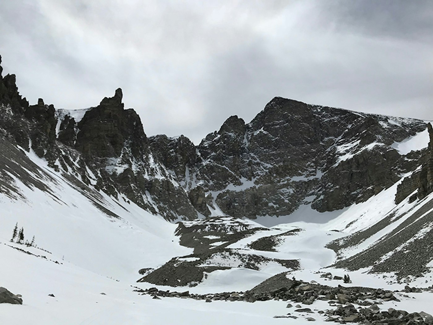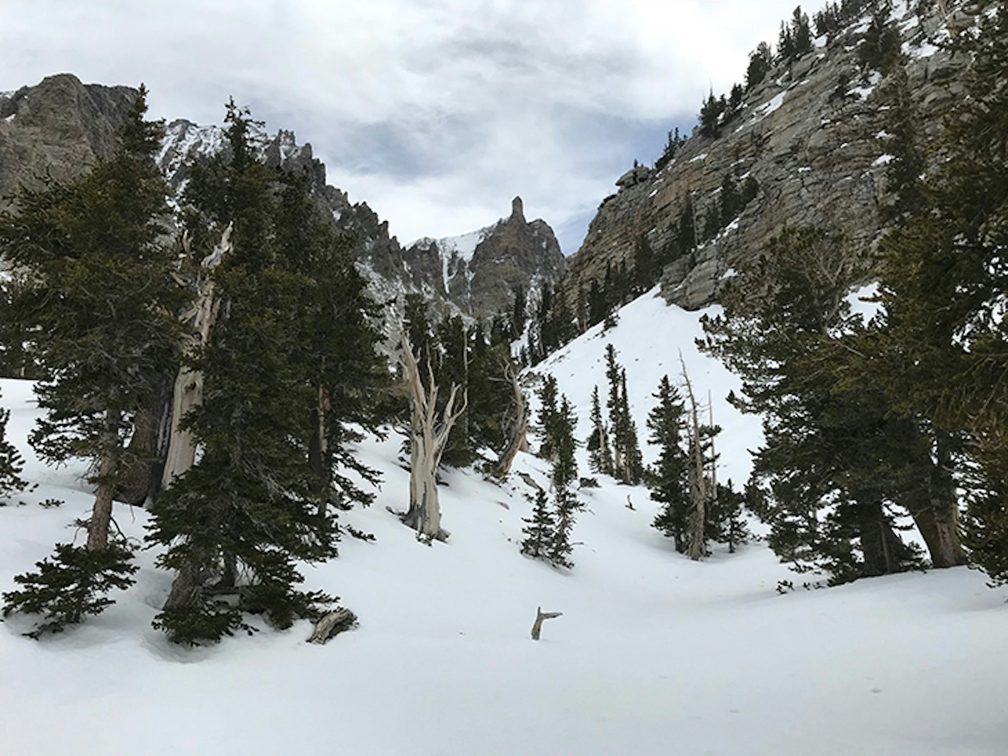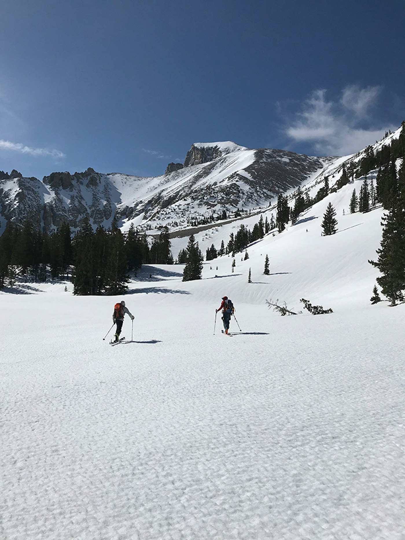 Once at the Wheeler Peak Campground, a north-facing gully came into view that appeared to be far more direct than the summer trail and would cut our approach time. This 1,000 foot shot was melted out on either side; perfectly wind buffed; just steep enough to punch straight up, while still gaining purchase from our skins; and was protected from the persistent howling of the western wind. It was one of many silver linings of the day.