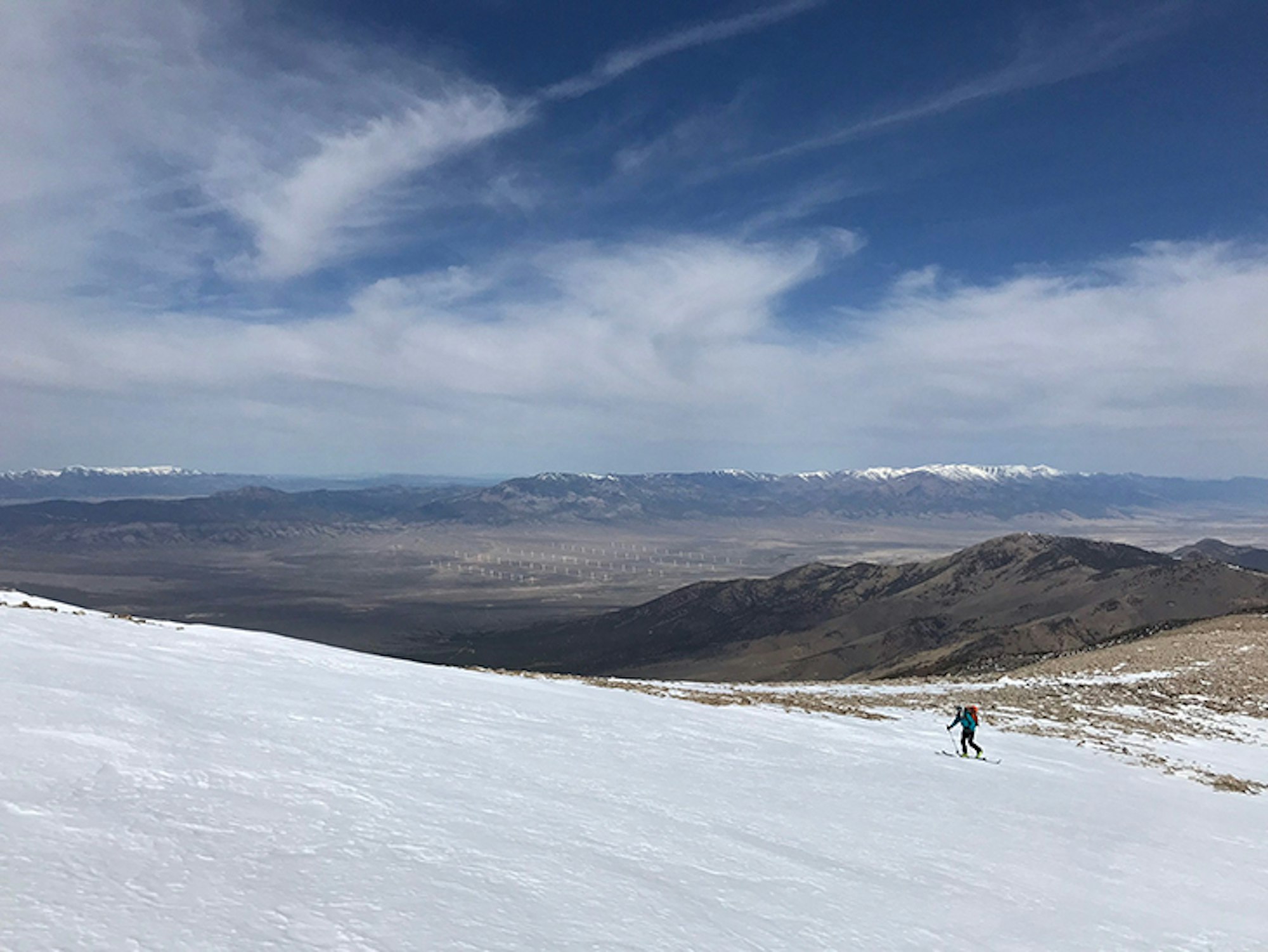 Before we knew it, we joined up with the summer trail, and as we crested the northwest summit ridge, we were greeted by insane views of the Great Basin roughly 7,000 feet below. A massive wind farm, crop circles, vibrant shades of green and yellow and many isolated mountain ranges jutting up from the desert as far as the eye could see made for an martian-esque backdrop. We all stopped to take photos, submitting to the hammering winds while gazing out at our amazing surroundings.