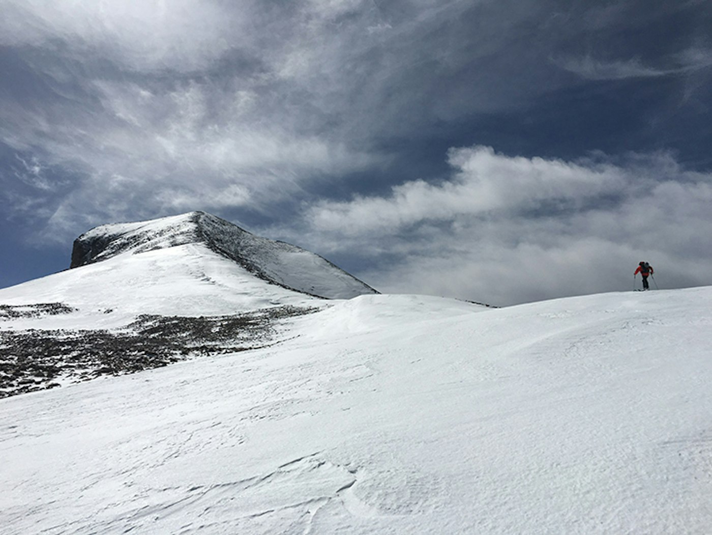 The final 1,000 foot push to the summit was straightforward but forced us to lay a convoluted skin track as we executed frantic switchbacks in the exposed talus to minimize the struggle of booting up a thin, rotten and wind scoured snowpack. The distance between the three of us lengthened as we each chose our preferred path of navigating the frustrating terrain.