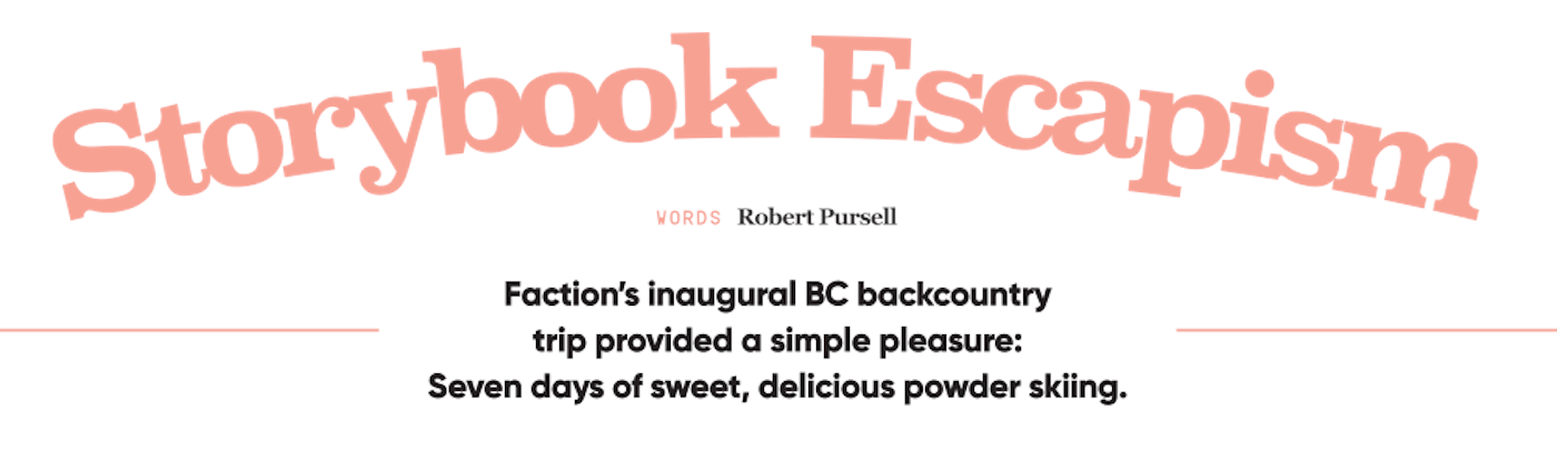 “We wanted to go on a dream trip: deep snow, pillow lines, no tracks. The team wanted to go out into the wilderness, away from everything, and focus 100 percent on skiing,” says Faction Team Manager Tim Harty of the trip’s origins. “For us, British Columbia is almost synonymous with backcountry skiing, and it was Antti Ollila’s backcountry debut. It was our first trip to Canada, we’ve always wanted to go and this year we finally made it happen.”