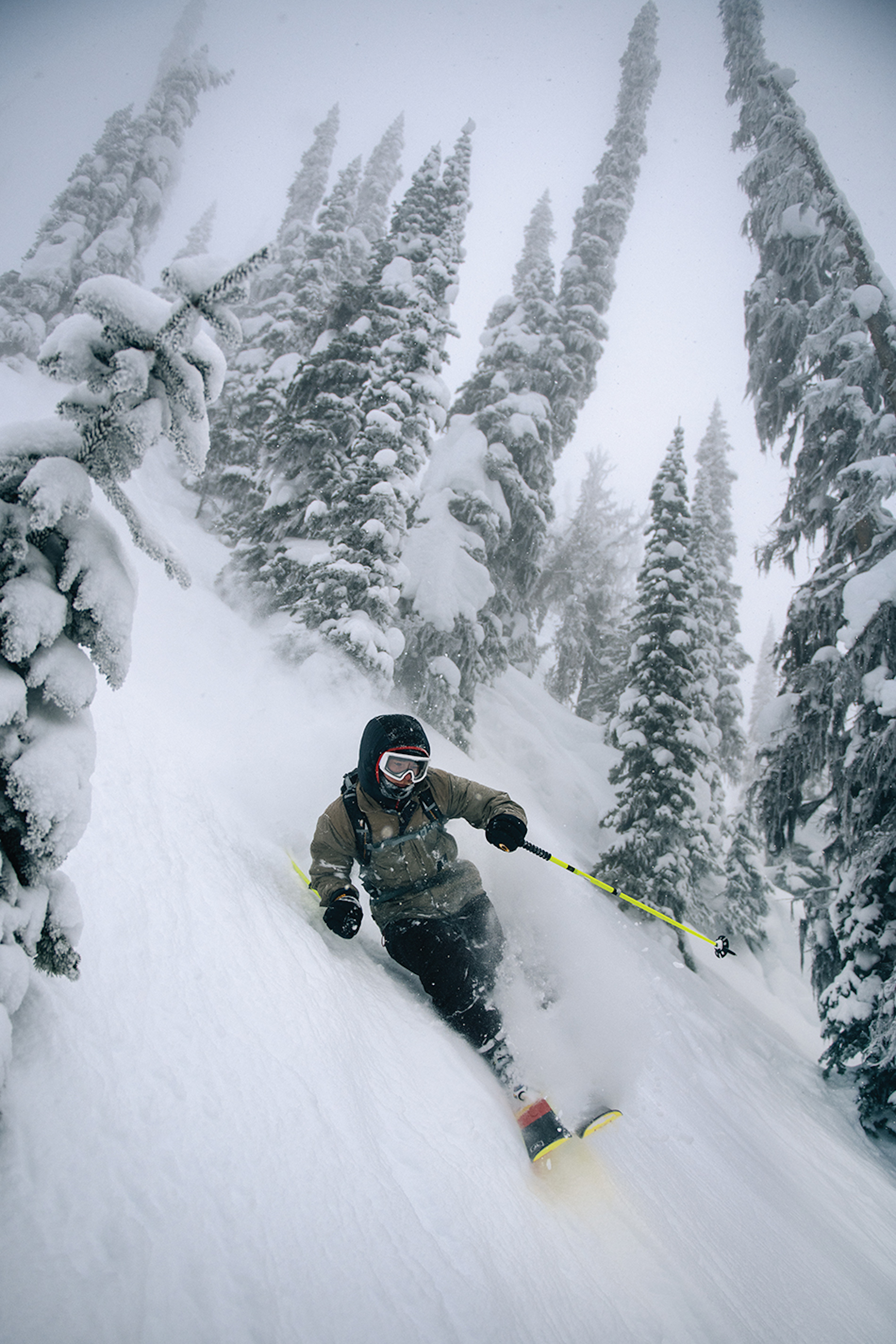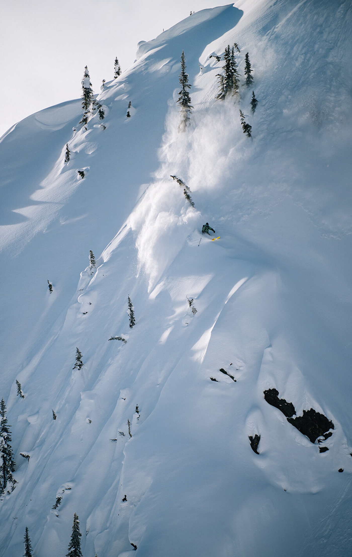 “It’s a lot slower pace, and it’s a lot more immediate and tranquil, and I’m glad more people are taking an environmental stance on it,” says Adams, with regards to human-powered freeride skiing. “That being said, I’ll continue [using] whatever tools it takes to get out in the mornings, whether it’s a heli or a sled. As destructive as some of that stuff is, it’s so convenient.”