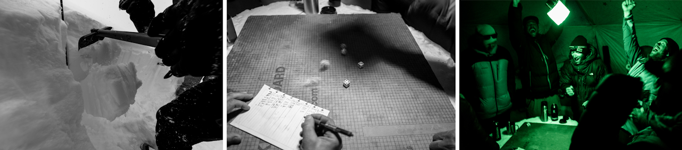 With one especially strong gust of wind, our level of concern goes through the roof, almost literally and figuratively. The canvas panels collapse, tent poles break and dishes go flying everywhere. Immediately, it’s all hands on deck. Half of us run outside to pull the tent back up while the others push from the inside. For several moments, it’s complete chaos. Instructions and ideas are yelled back and forth. The structure is so gargantuan and the collapse so great—the tent was homemade, in case you’re wondering—that it requires raw determination, teamwork and frankly, a stroke of luck for us to gain the upper hand on the situation. P-cord is tied around poles, joints are reinforced with duct tape, dead-men [pieces of wood, duffle bags and other objects buried in the snow to serve as anchors] are dug and eventually a massive, 10 foot by 30 foot wall is constructed around the tent’s perimeter, serving as a wind barrier. Several hours later, utterly exhausted now, we’re back in our home. Our looks of worry are replaced with blank stares. A sort of what-the-f#ck-just-happened vibe overcomes the gang as we take inventory of our situation: We’re ten days into the trip and we almost just lost one of our most crucial pieces of gear. The forecast shows no sign of improved weather conditions and we’ve hardly skied a single line.