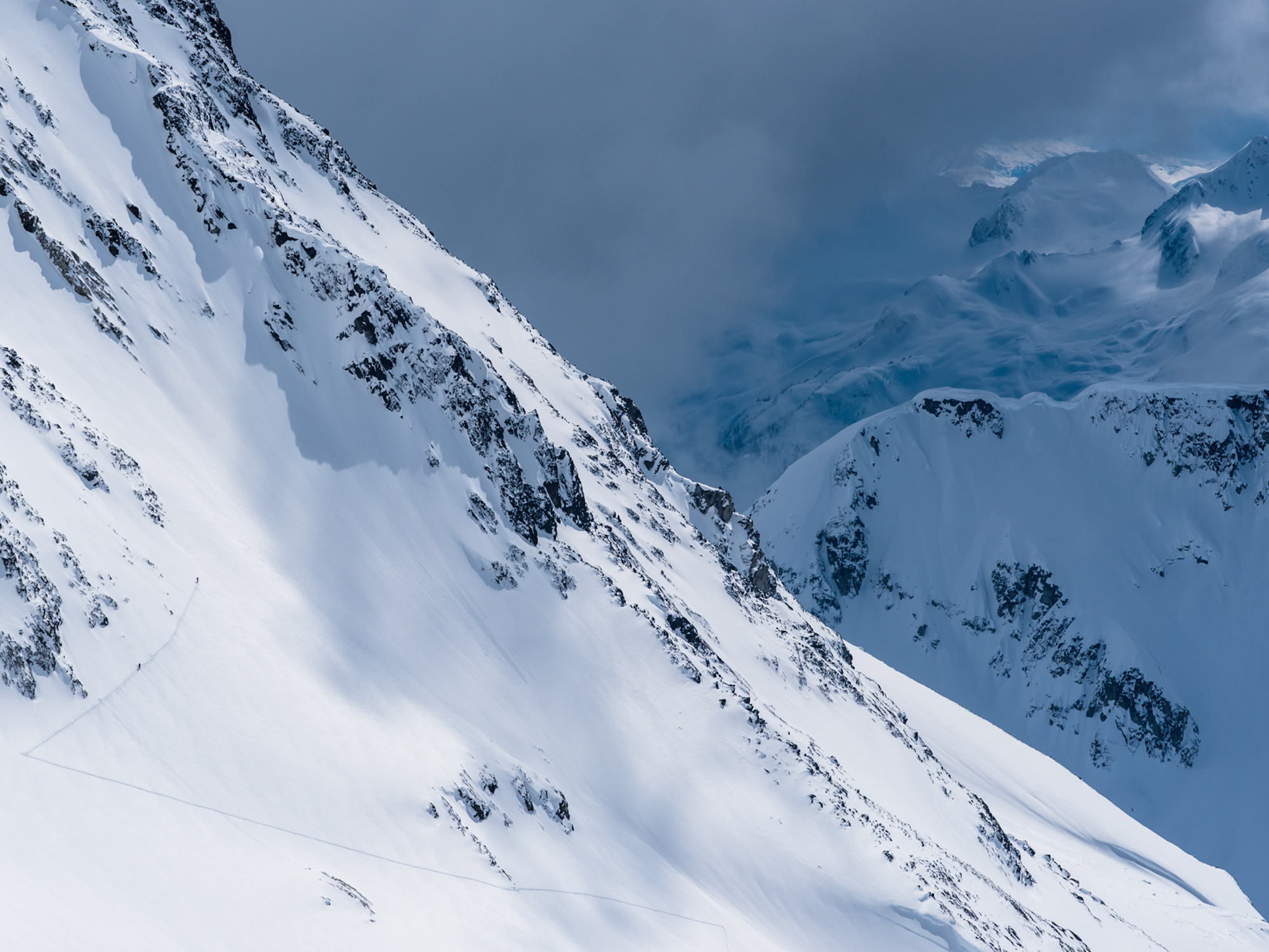 On paper, the idea for this trip was what big-mountain skiing dreams are made of: Helicopter in enough supplies for three weeks and set up camp in a small corner of BC’s Coast Mountains, just north of Whistler, where film-worthy lines abound and access to said lines is literally right outside the front door. The brain child behind this particular mission is Ian McIntosh, a BC native who has spent well over a decade exploring the mountains surrounding Whistler. Rounding out the crew is myself; Dane Tudor, a one-time backcountry booter star turned mountaineer and camping aficionado; renowned backcountry guide Zahan Billamoria; photographer Reuben Krabbe; camp manager Eric Richmond; and cinematographers Dutch Simpson, Austin Hopkins and Ben Dann, documenting the experience for Teton Gravity Research. It’s a certified dream team when it comes to ascending and descending rugged peaks. The constant clouds and incessant winds have done little in the way of eroding our stoke—a true testament to the strength and commitment of the group.