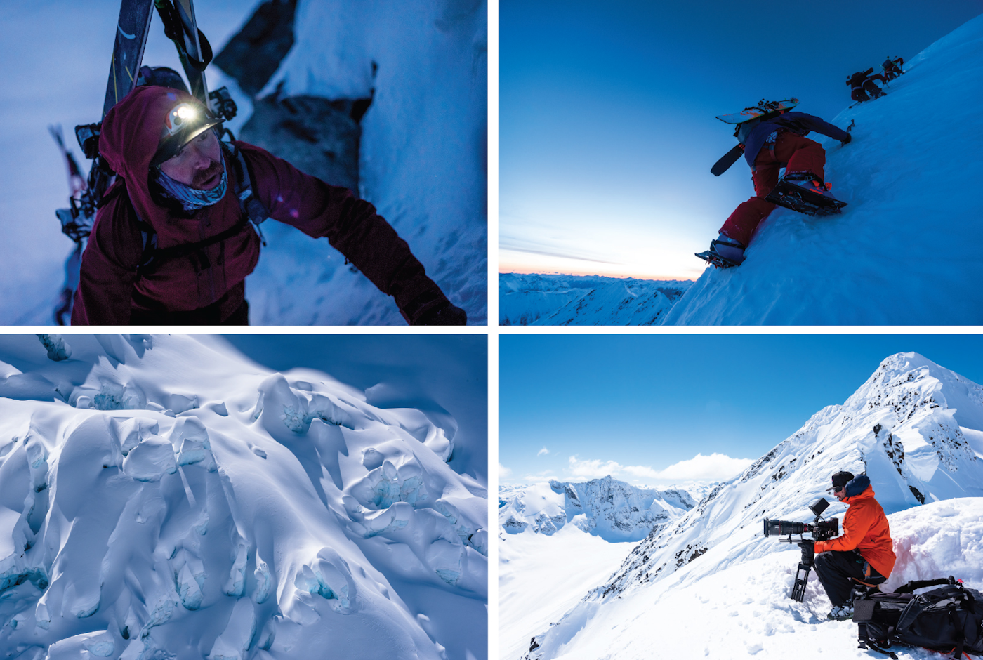 Unlike most ski filming endeavors, in which one seeks out unique, individual lines, our group has decided to ski in generally the same area, largely due to safety concerns associated with being so remote. After some snow assessment and ski cuts on belay, we pack away the ropes and begin to drop in to the true north face after skirting around the northwest dogleg. Skiing last, I have a front row seat of a plan evolving to near perfection. The snow is delectable, boot-top powder and Ian and Dane leave massive contrails that catch the afternoon light as they make sweeping turns down to the meeting point. Finally, I too tip in. The snow is not overly deep, but provides just enough confidence to turn up the speed dial—within reason, of course, given the terrain.