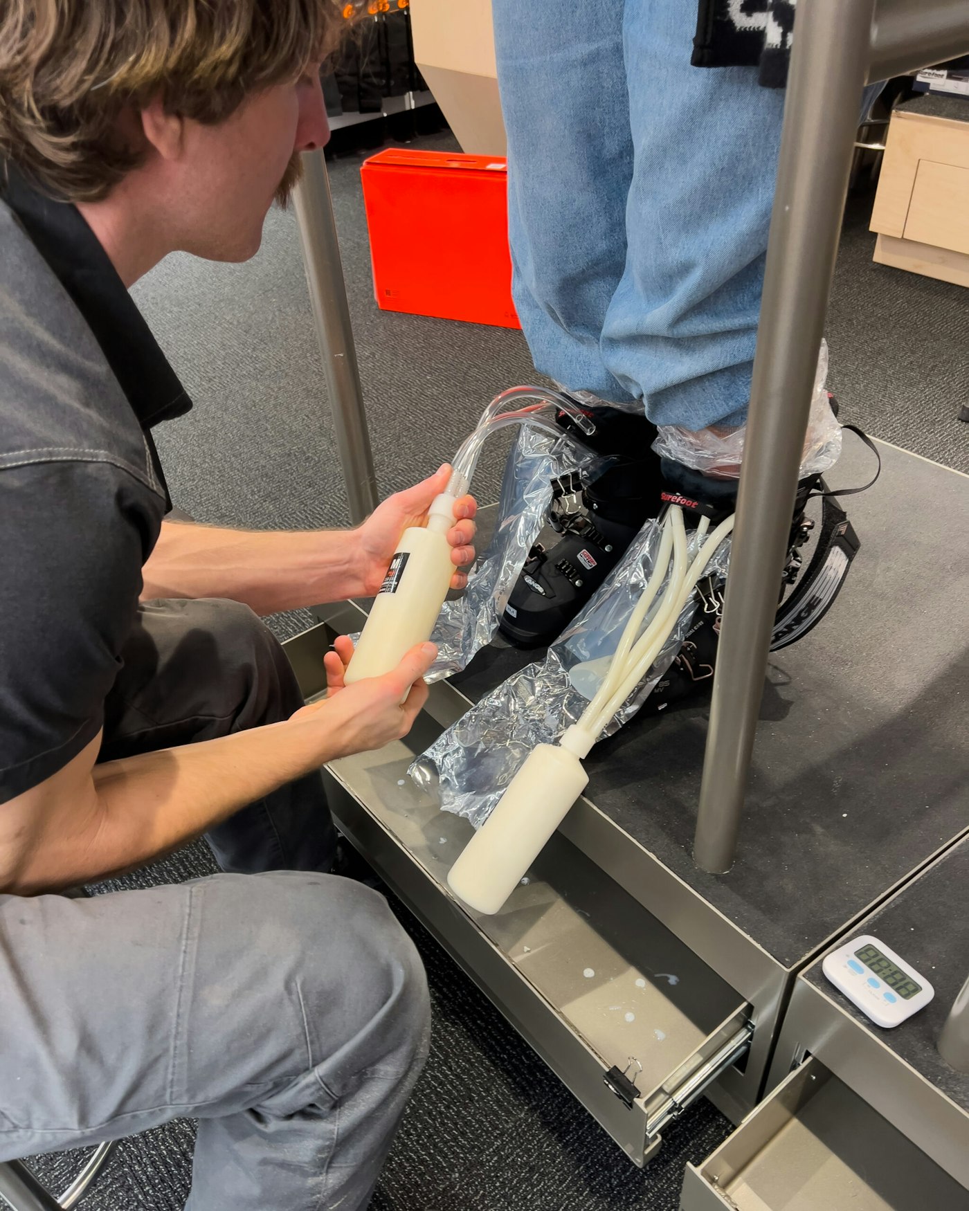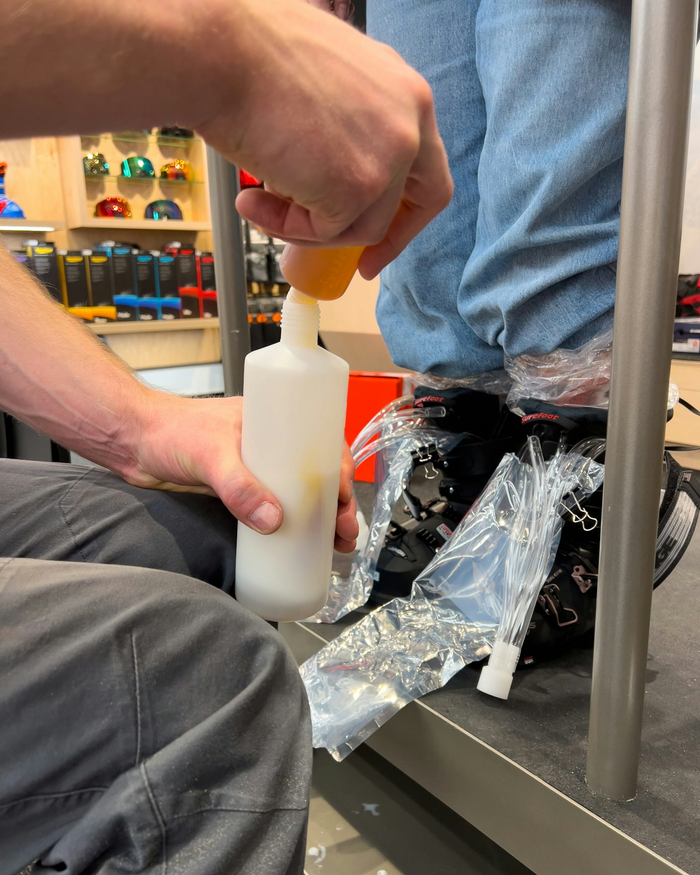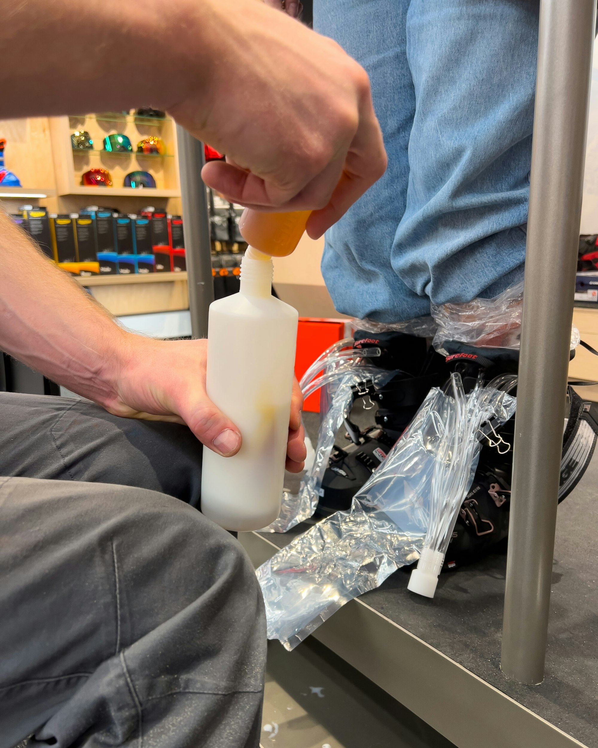 After your insoles are ready to go and your shell is selected, it is time for your custom liners to be formed. First step is choosing the liner blank that is right for you—this can be one for racing, backcountry, resort skiing and so on. Once chosen, your boot fitter will put together your selected shell, freshly made insoles and liner. Then the boot is put on your foot, which is covered in a plastic bag for precaution, and is ready to be foamed. Standing in an athletic ski stance, a boot fitter mixes and shakes together part A and B of their foam mixture and quickly connects the bottle to the hoses coming from the liner. Inside the bottle an exothermic reaction is occurring, producing a quickly expanding foam and heat. The foam quickly outgrows the small bottle and shoots through the tubes, equally distributing foam all over the foot and calf with extra emphasis on the heel, ankle and shin. After five minutes the foam has hardened and your boot fitter pulls out the tubes, and just like that you now have a 100-percent custom pair of ski boots.