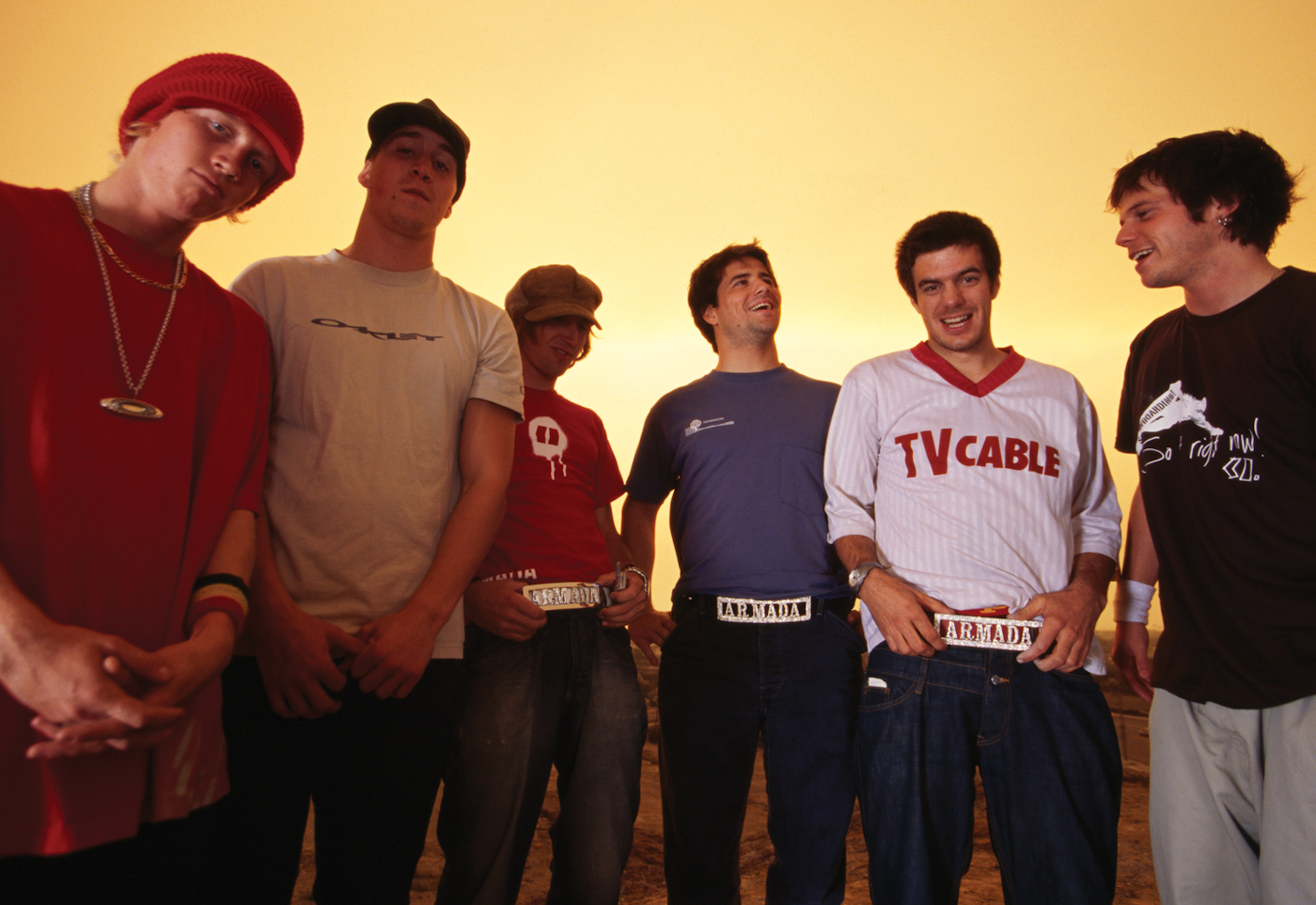 The Armada Skis athlete team, circa 2002. From left to right: Tanner Hall, Anthony Boronowski, Boyd Easley, JP Auclair, Julien Regnier, JF Cusson