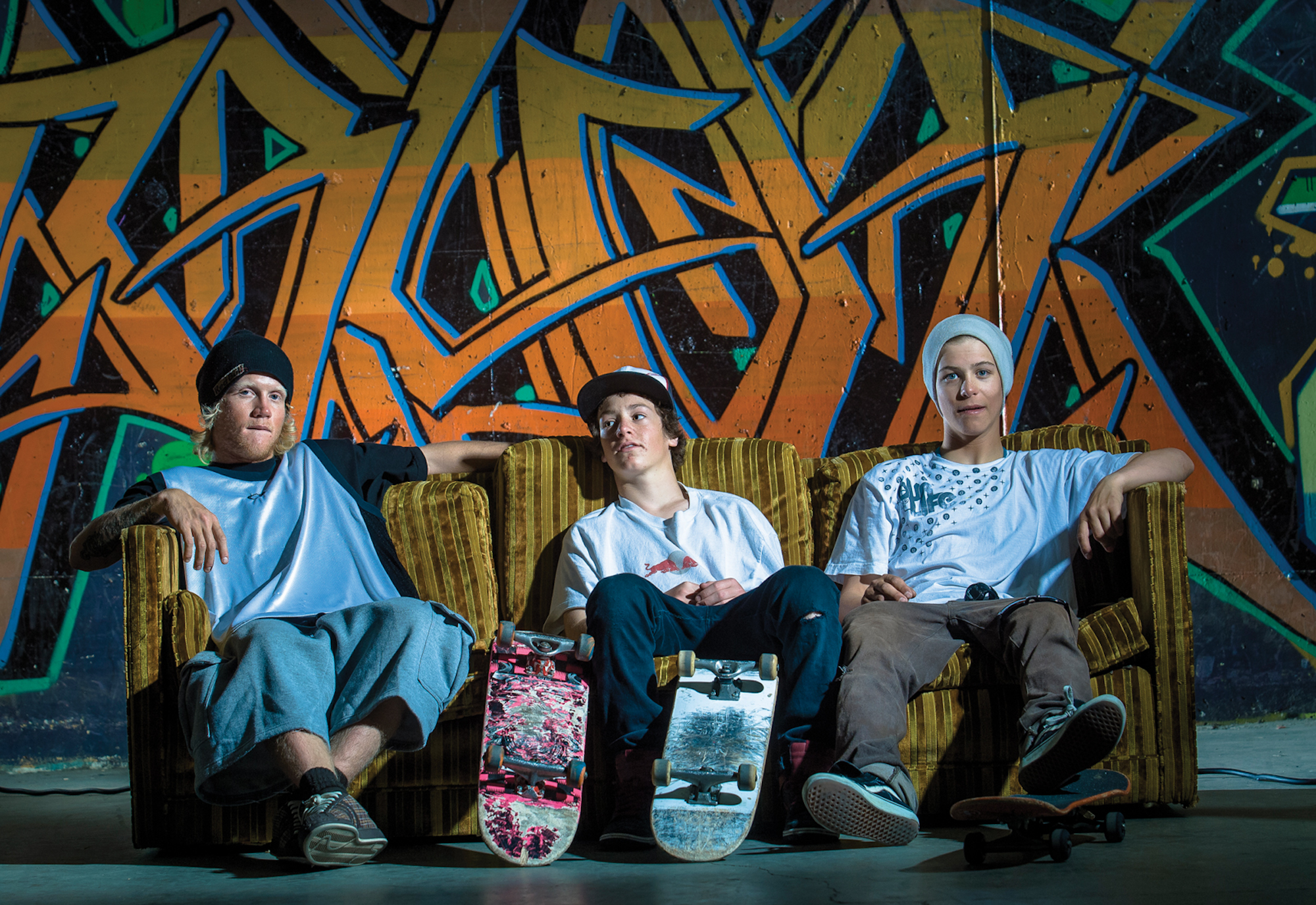 Young guns at the skatepark. From left to right: Tanner Hall, Sean Pettit, Kye Petersen | PHOTO: Blake Jorgenson, 2004