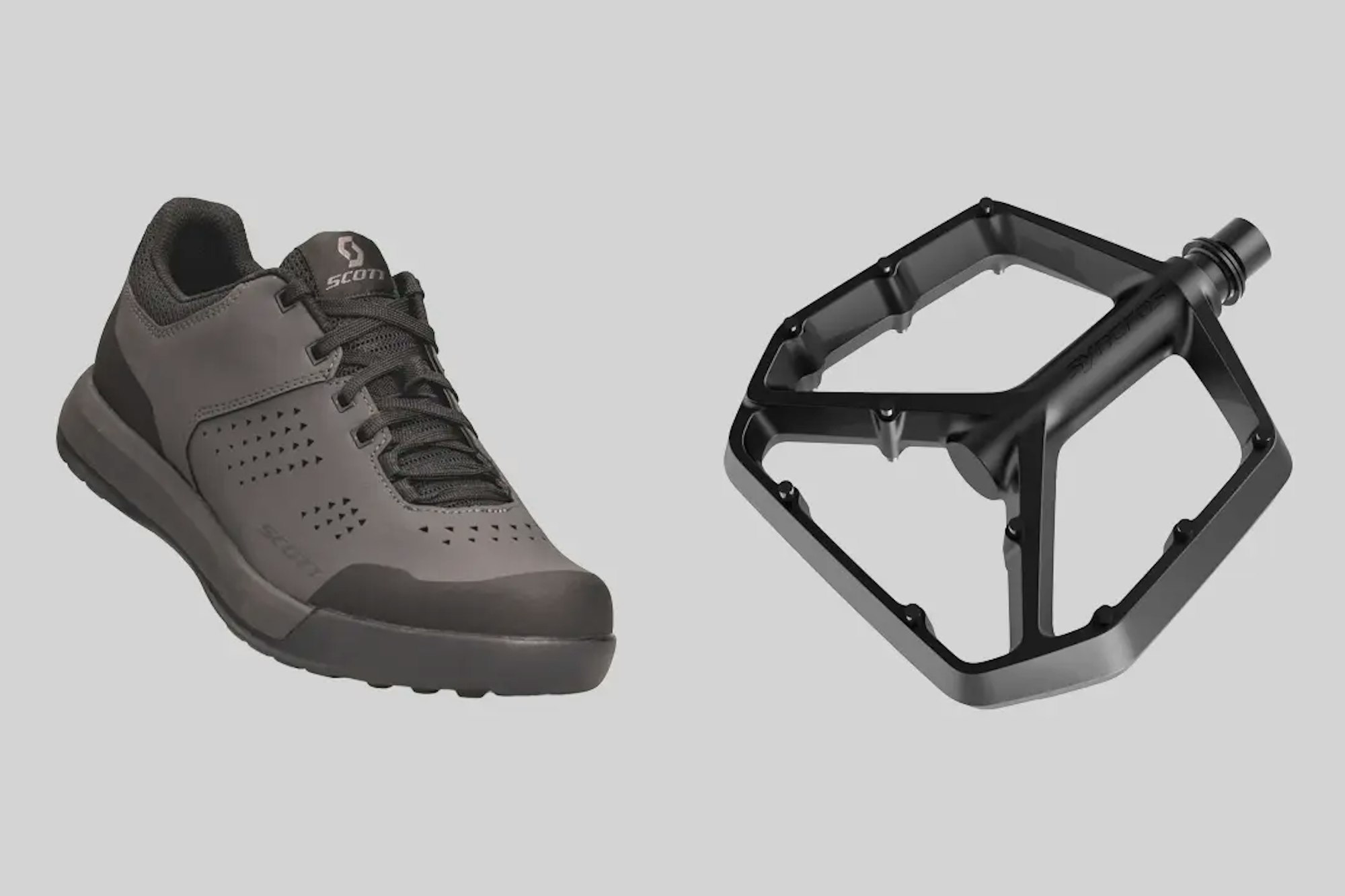 Now, this will probably spark a debate between the flat and clipless crowds, but for this build we’re running flats—flat shoes and flat pedals. We think they’re the most user-friendly option. Sure, you might lose a bit of uphill performance, but for both new and experienced riders, they build confidence on the descent thanks to how easy it is to bail. Plus, when you roll into the brewery after your ride, you’re not the loud guy with clicky shoes. We’re going with the Scott MTB SHR-ALP lace shoe for its classic silhouette and grippy sole. It also features a burly plate under the insole to prevent flex, giving you a stiff platform to rip trail. Pair it with Synchros Squamish Flat Pedals—lightweight, aluminum-cast, and loaded with surface area for grip and stability.