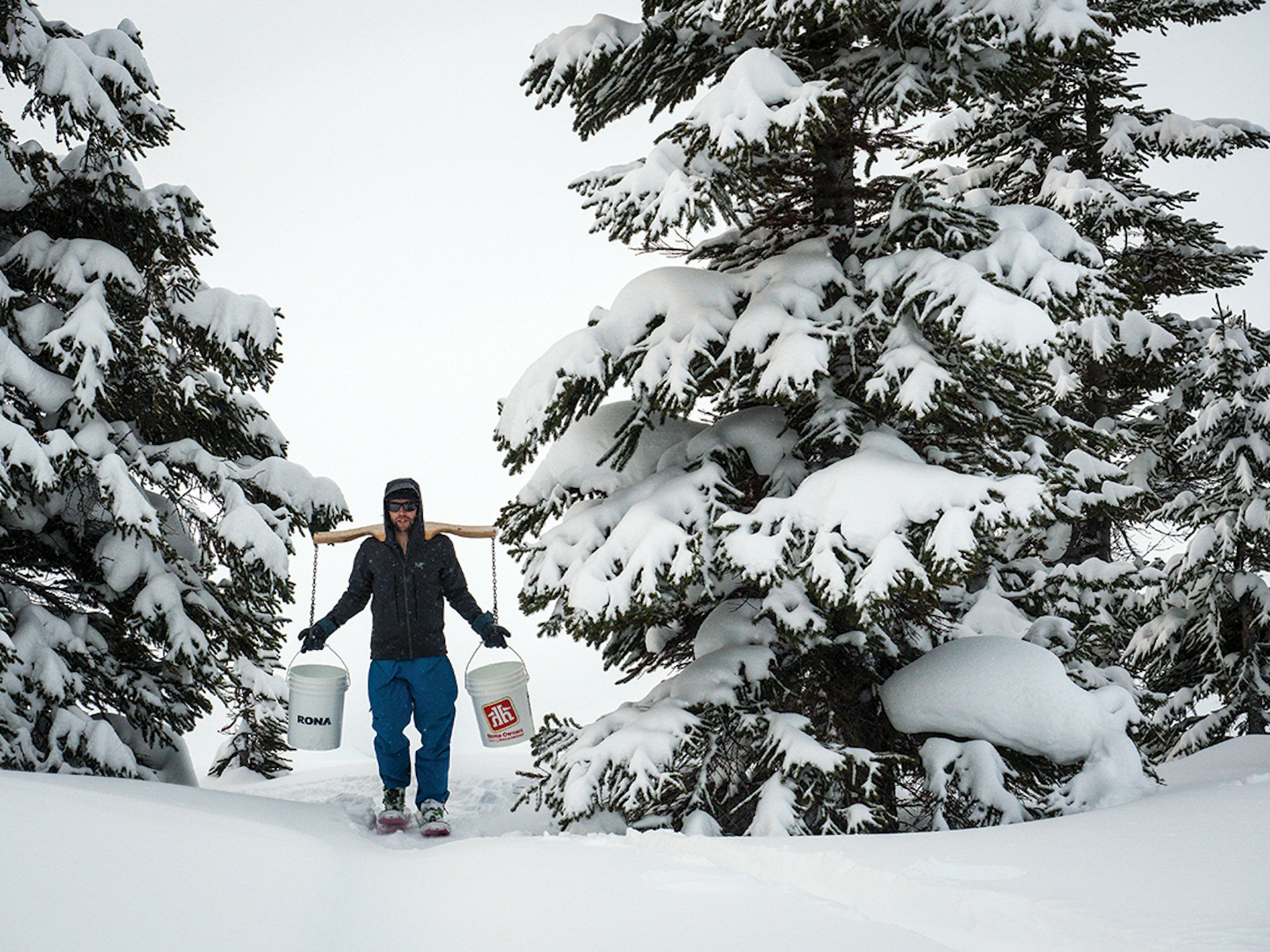 Hoji is knocking over sh#t towers in the outhouses. He certainly isn’t doing it for fun; it’s just part of his inborn compulsion to keep all the elements of a mechanism running efficiently. One moment he’s skinning up from the water hole slinging two buckets from a yoke, another he’s fiddling with the propane heater, then he’s carrying in firewood and shortly thereafter shoveling the roof. And when daylight fades, he toils late into the evening on someone else’s skins, boots, bindings or whatever other contraption needs repair. Of course, that’s all standard Eric “Hoji” Hjorleifson stuff. But on this two week trip, aside from throttling down burly lines for Matchstick Productions’ cameras, for $75/day he’s assumed the job as the hut’s official custodian. So, prior to popping down pillows of dreamy powder he’s busy toppling poo. Which he’d probably be doing anyway, whether you paid him to or not.