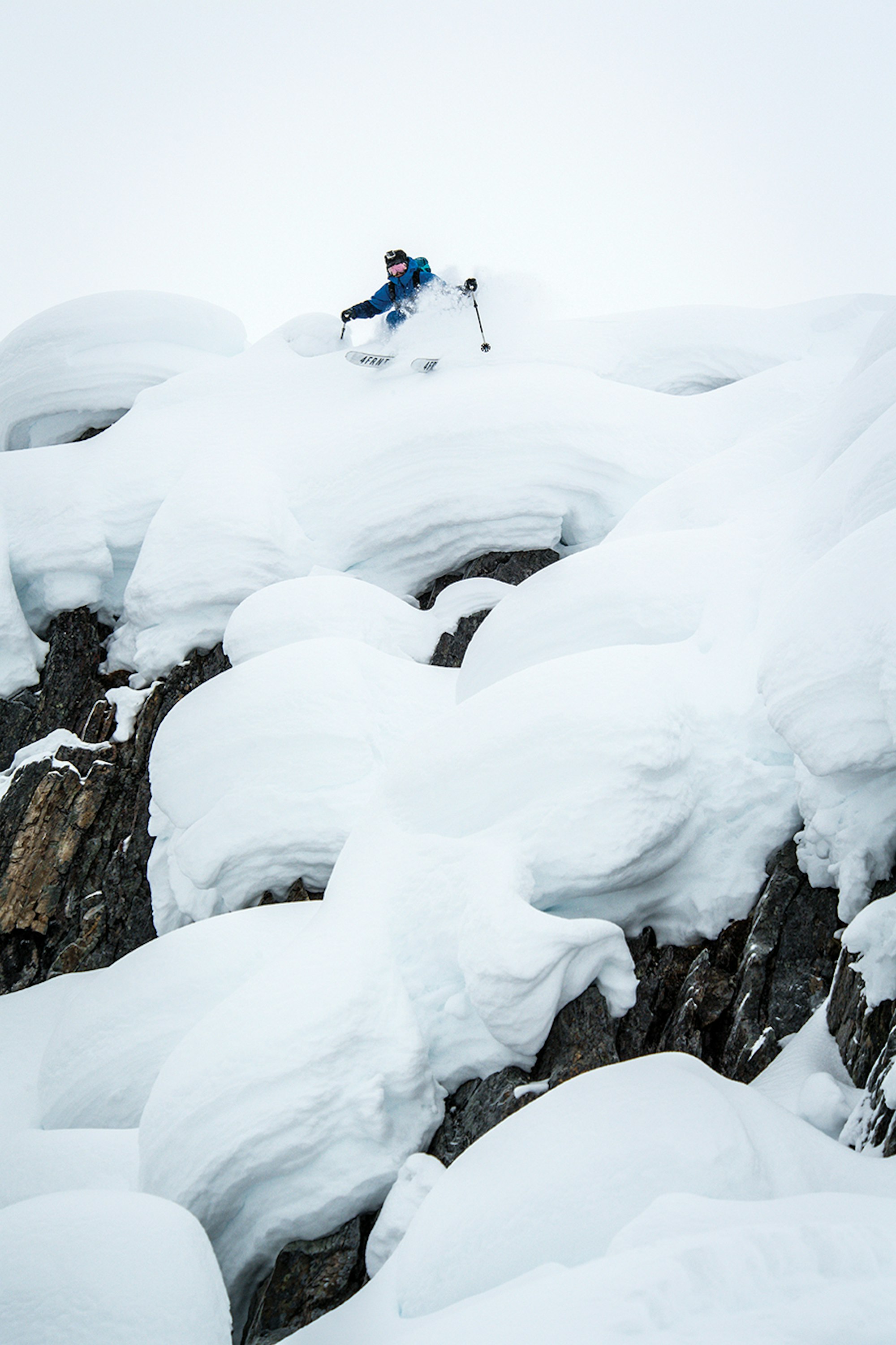“Playful isn’t quite the word I would use [to describe Meadow Lodge],” says Rubens. “Maybe that’s the irony of the name ‘Meadow.’” Below the lodge, ridges fall away in a scrambled and intense fashion, with pillows stacked upon pillows that are pleasing to the eye, yet hard on the brain. Regular questions that flow through Rubens’ mind regarding the skiing here include, “Is that doable? Can I gap to that? Would I splat on that tier? Can I dump speed there? Will I have any markers to know where the hell I am?”