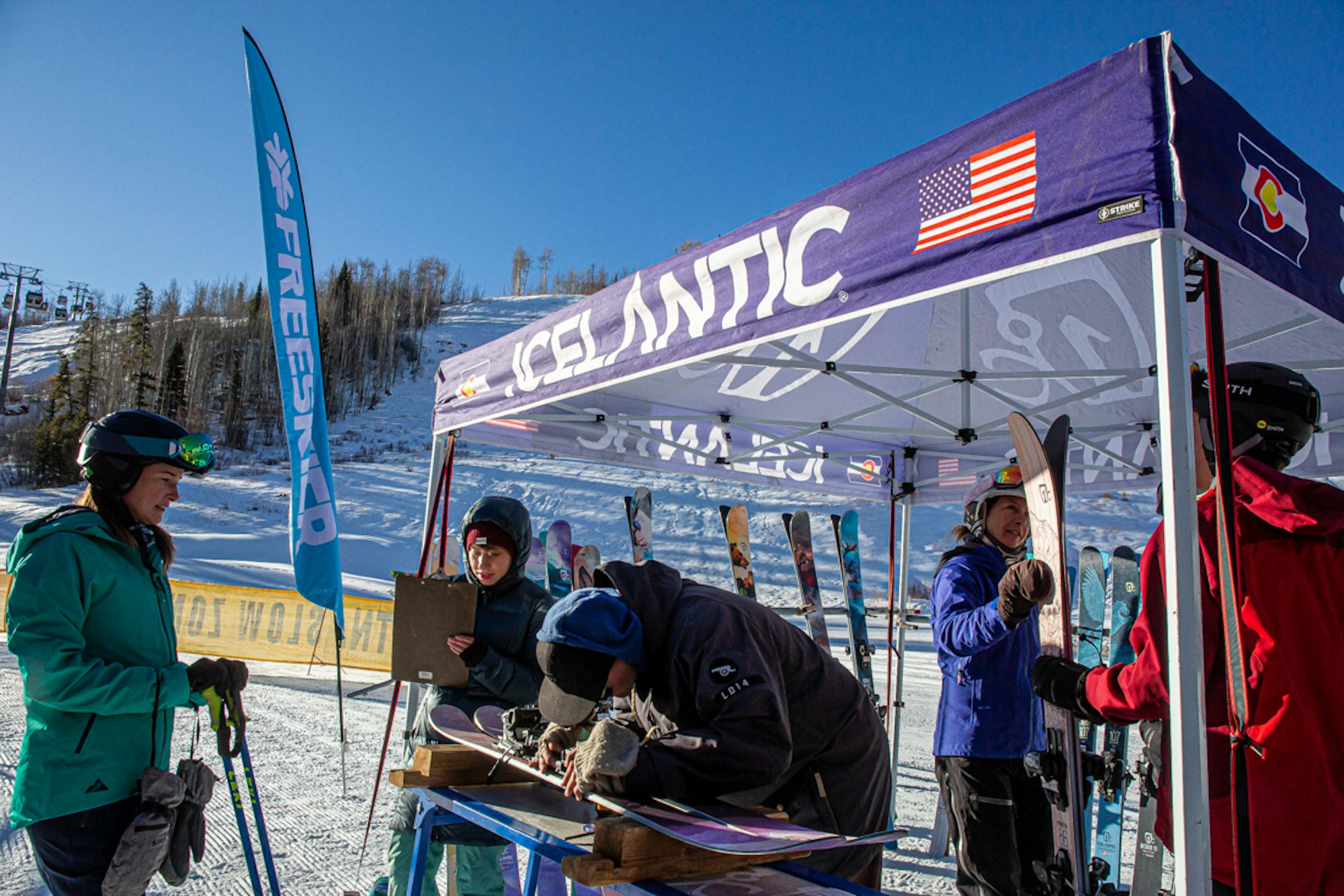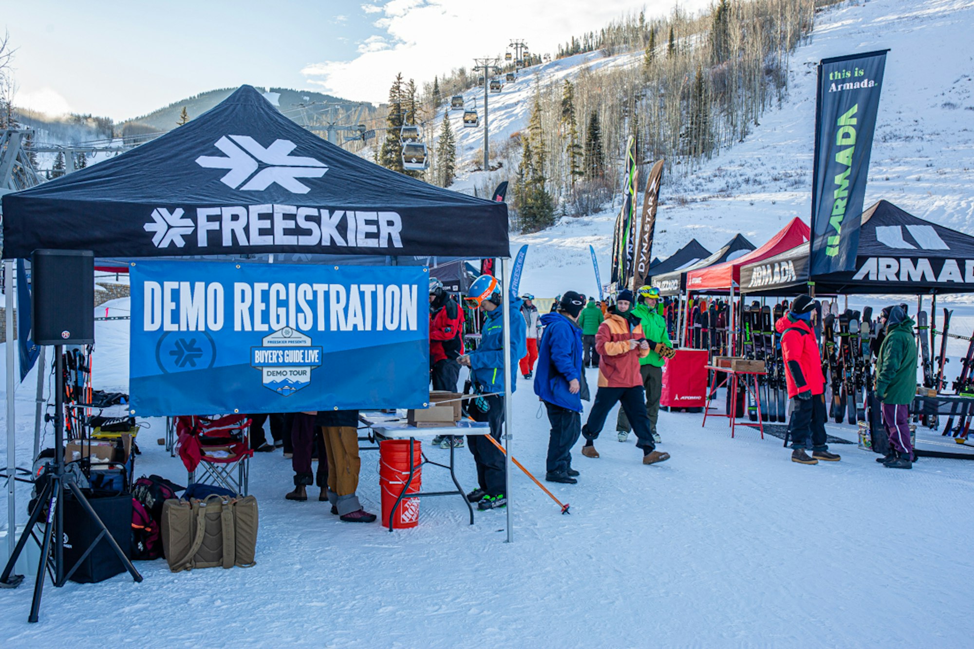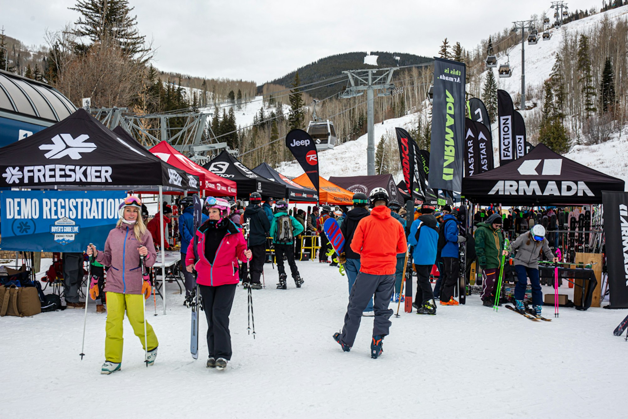 The ski gods graced us with a picture-perfect early-season ski day for the first stop of the inaugural FREESKIER Buyer’s Guide Live Demo Tour in Vail, Colorado. The sun was out and the stoke was fiery as skiers by the hundreds––hungry to test out the best of this year’s skis from 20 different brands, including Armada, Atomic, Blizzard, Dynastar, Elan, Faction, Fischer, Folsom, HEAD, ROMP, RMU, Icelantic, K2, Kästle, Liberty, Line, Nordica, Rossignol, Salomon and Völkl––lined up at the base of Gondola One long before the lifts started spinning at 9 a.m.