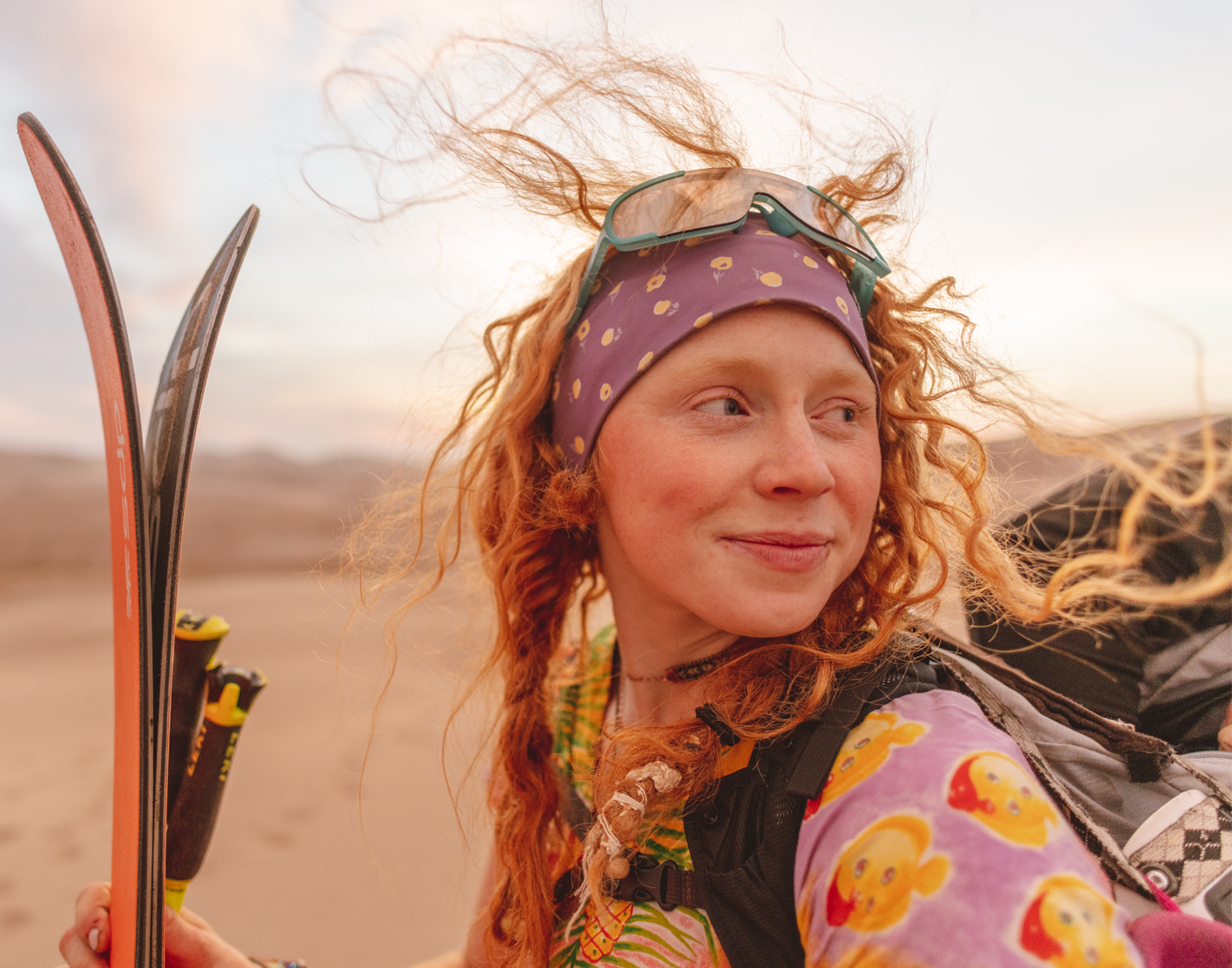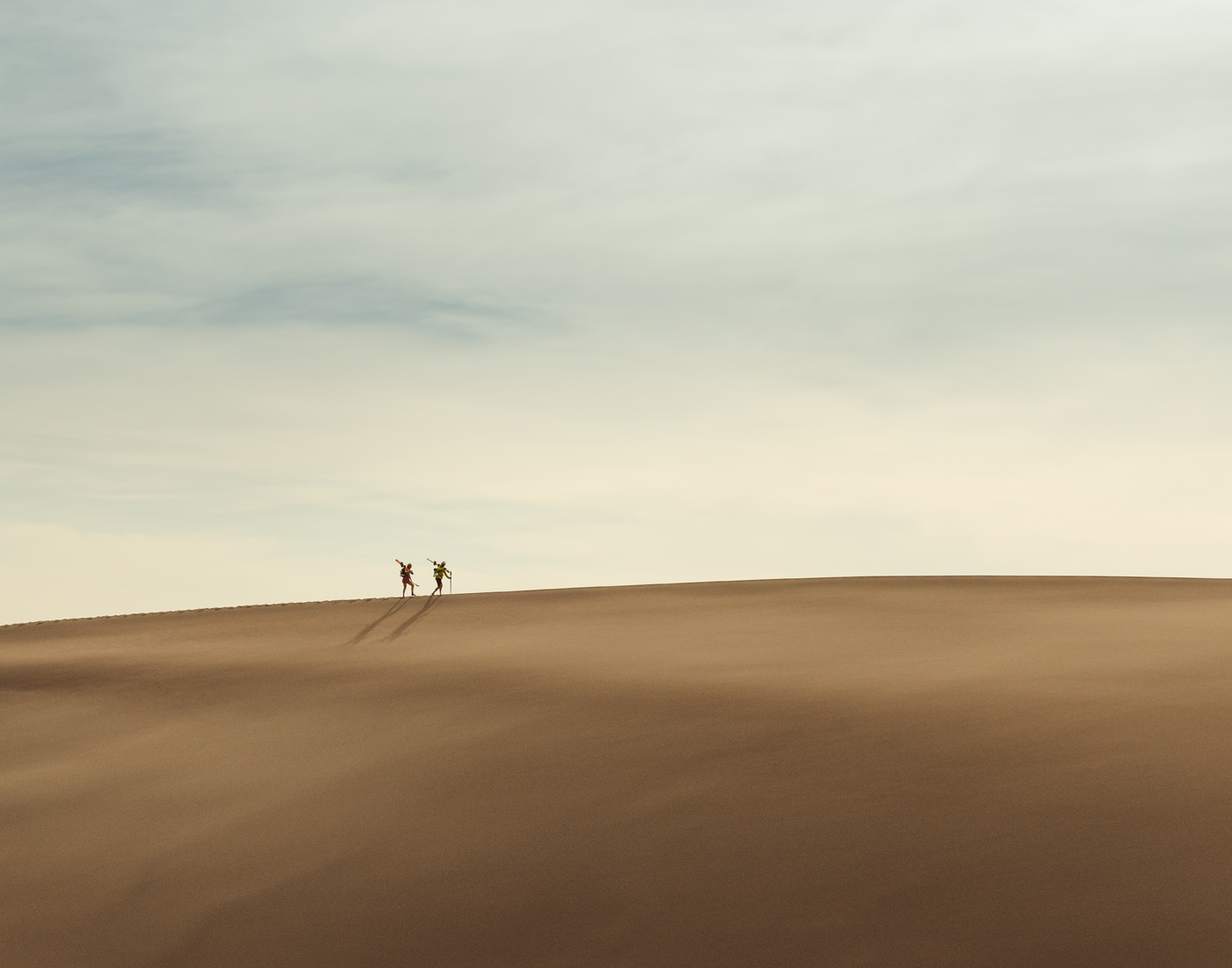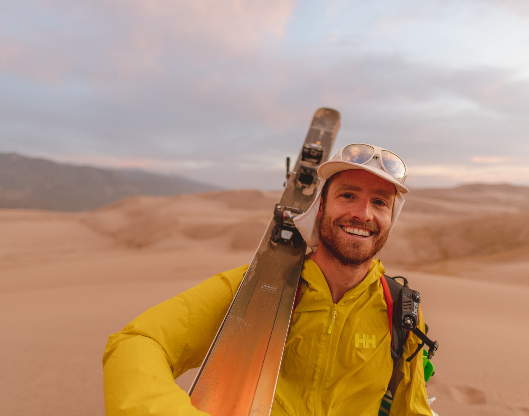 The morning brought with it a stunning sunrise and another dose of reality. Skiing on sand is nearly as difficult as hauling shit in a sled. The moment of drop in on my first “line” and the moment of “oh shit, time for Plan B” were simultaneous. Friction proved again to be a worthy advisory–I could barely get going fast enough to turn. This is where my strongest contribution to the group came in handy. I’m a skier, yes, but I’m also a part of a team, a team that makes art, and I know what it takes on my end to create something worth looking at.