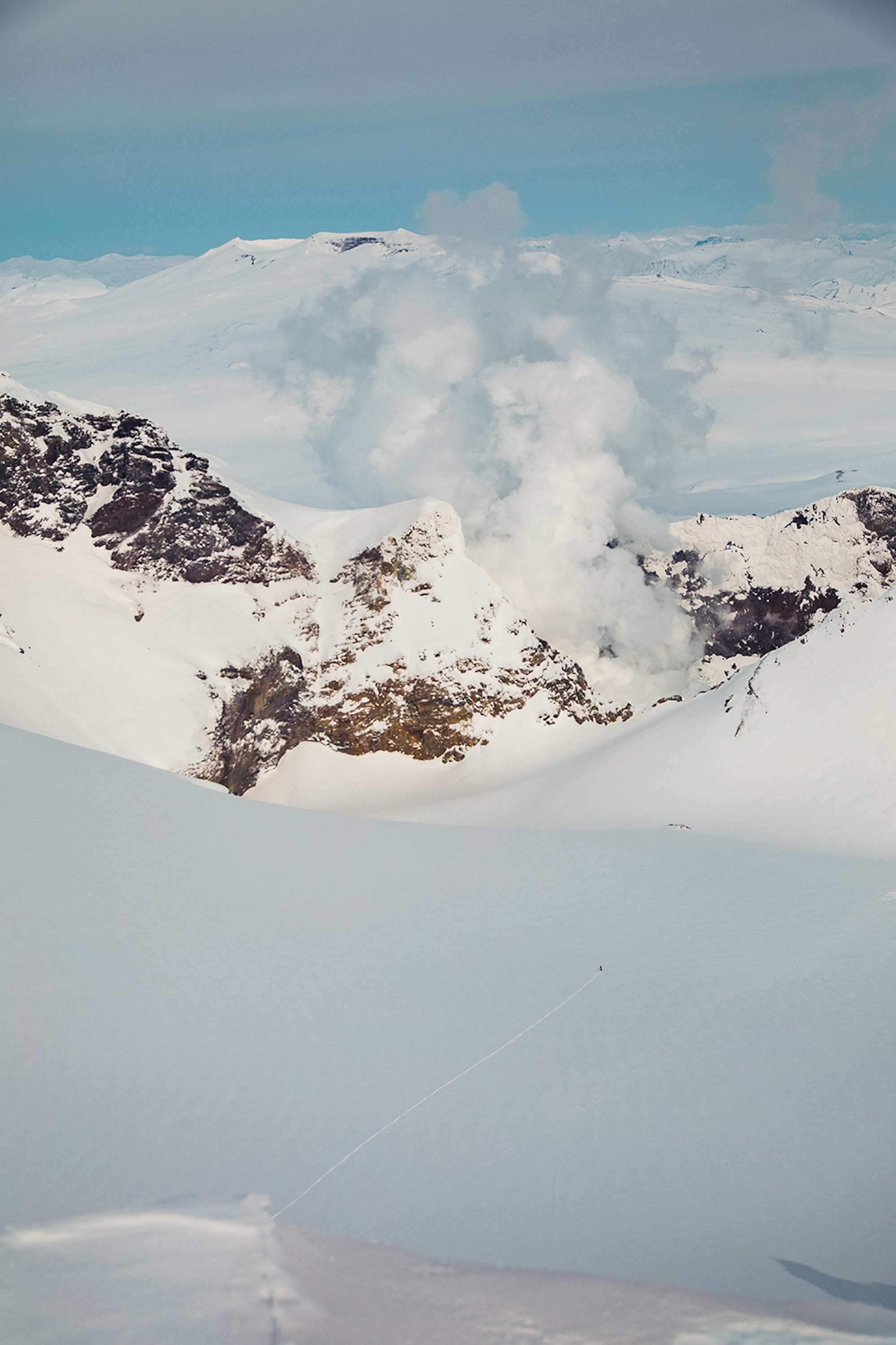 This was uncharted territory for us civilian cowpoke. For Vladimir, his son and the pilots, this was home, and they knew it like the back of their hands. All we could do was sit back and hold on as they transported us to ski lines that even the boundaries of our own imagination couldn’t have entertained. We teamed up for figure eights down pristine powder bowls and skied past geysers propelling scorching mineral water a hundred feet high. They took us to corn-filled couloirs and duned slopes that led us right down to the waters of the North Pacific. One evening we skied until 9:00 p.m., sharing turns, laughs and fist bumps together on sparkling, golden-washed volcano flanks as the sun bid the edge of the world adieu. The next day, we descended into the belly of an active volcano, Mutnovsky. We gagged on the fumes emanating from an alien landscape and looked back at the ramp of creamy snow that led to the gurgling, oozing crater where we stood. The land of fire and ice, indeed.