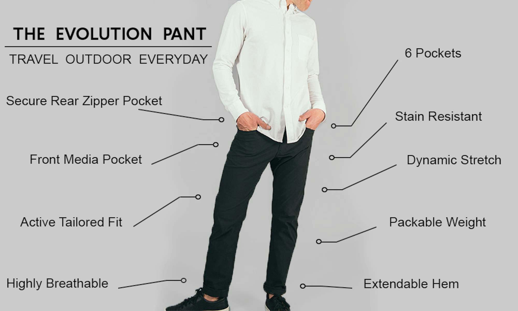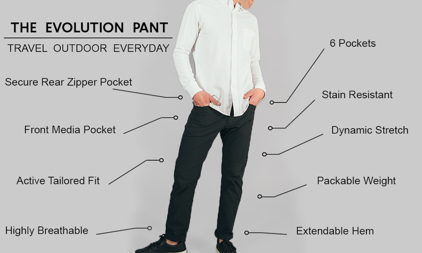 Lightweight—only 13 ounces—and packable down to a size smaller than a t-shirt, with a soft cotton feel to the touch, the Evolution Pant truly looks like your finest pair of Dockers, but performs like high-grade nylon hiking pants.