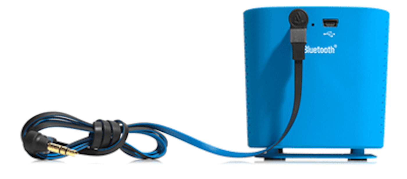 The cube has a driver on the left and right side as well as a passive radiator on the bottom to handle the lower frequencies. For its size, it puts out pretty good sound. You can connect it to your device with an included auxiliary cord that measures about 3-and-a-half feet or by using Bluetooth connectivity. Wireless connection is relatively simple: hold down the Power/Play button for 10 seconds and once the blue ring is flashing, your Bluetooth device should be able to connect. When wirelessly connected, the other two buttons on top double as next track/volume up and previous track/volume down. If you connect using the auxiliary cord they will simply act as volume buttons.