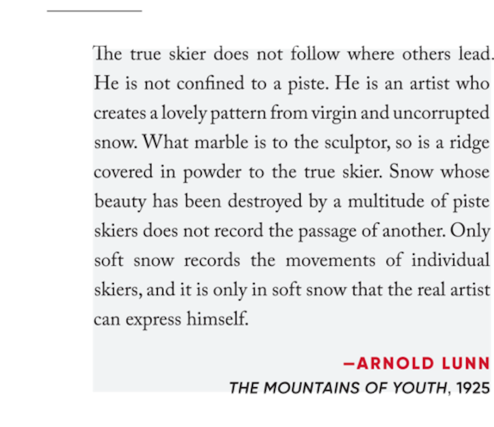 Powder skiing is about words but being unable to speak. About telling but being unable to describe. About how the silence that surrounds somehow amplifies the pounding of your heart, the rasping of your breath, the wind in the trees. It’s about involuntary grunts of effort and unconscious squeals of delight. It’s about inspiration. Desperation. Bad poetry. Broken marriages. Grins. Silliness. Frozen toes and ice-cream headaches. Magical turns. First tracks and lost skis. That feeling of submerging—and then flying, momentarily weightless. It’s about trudging, navigating and riding over, through and around boilerplate, sastrugi, crust, slab, crud and all manner of bad snow just to get to the good stuff. It’s a way of feeling. A way of thinking. A way of life. A way of sharing.