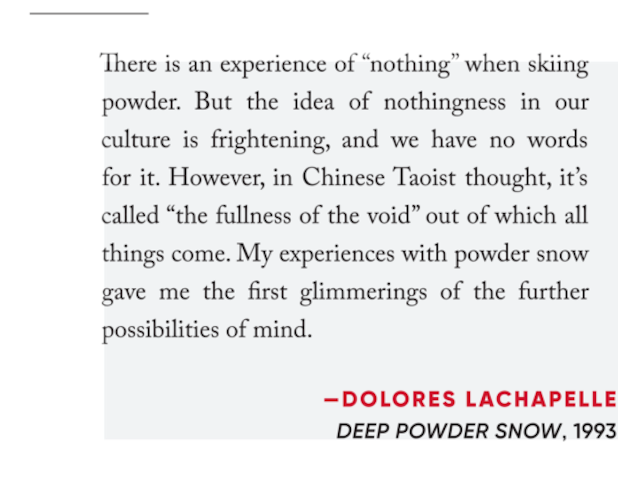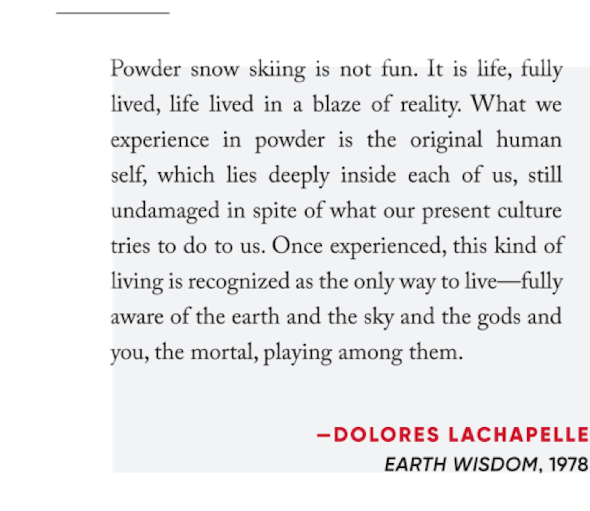 This last quote might be a little too Zen for most, but LaChapelle has a point. When you get right down to it, skiing powder isn’t really about the outer experience but the inner. About that crucial intersection of mind and body, where thinking and feeling can’t be teased apart. About stopping at the bottom of a slope and looking back up at a line you’re convinced was the best run of your life, hanging on your pole straps and sucking air through a winded smile that doesn’t belong just to you but to everyone who’s ever stood in a similar spot with shaking legs and gasped, “Let’s do it again!”