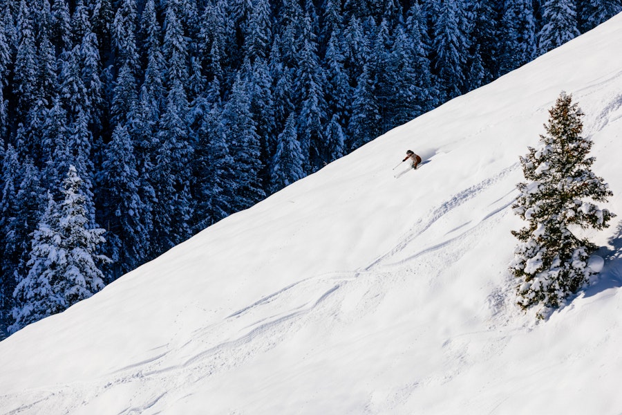 The more prominent of the resort’s two peaks, Bald Mountain is affectionately referred to as Baldy and features a steep, consistent vertical drop of 3,400 feet. It’s a mountain that satiates the appetites of heavy hitting freeride skiers like Karl Fostvedt and Lucy Sackbauer, as well as average Joes like us. The varied terrain allows skiers to choose their own adventure while still ending up back with their friends at the bottom, to hop into virtually non-existent lift lines.