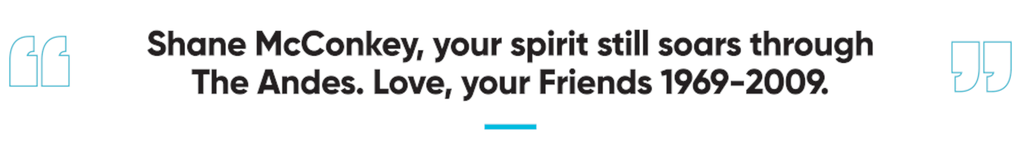 Pro skier Chris Davenport skis up to the plaque memorializing the late Shane McConkey, placed along the rocks underneath the Plateau lift in Portillo, Chile. He shares the message aloud, then refills the plastic bottle of Jim Beam that calls the shrine home with a somber, “Miss you buddy!” to the freeskiing pioneer.