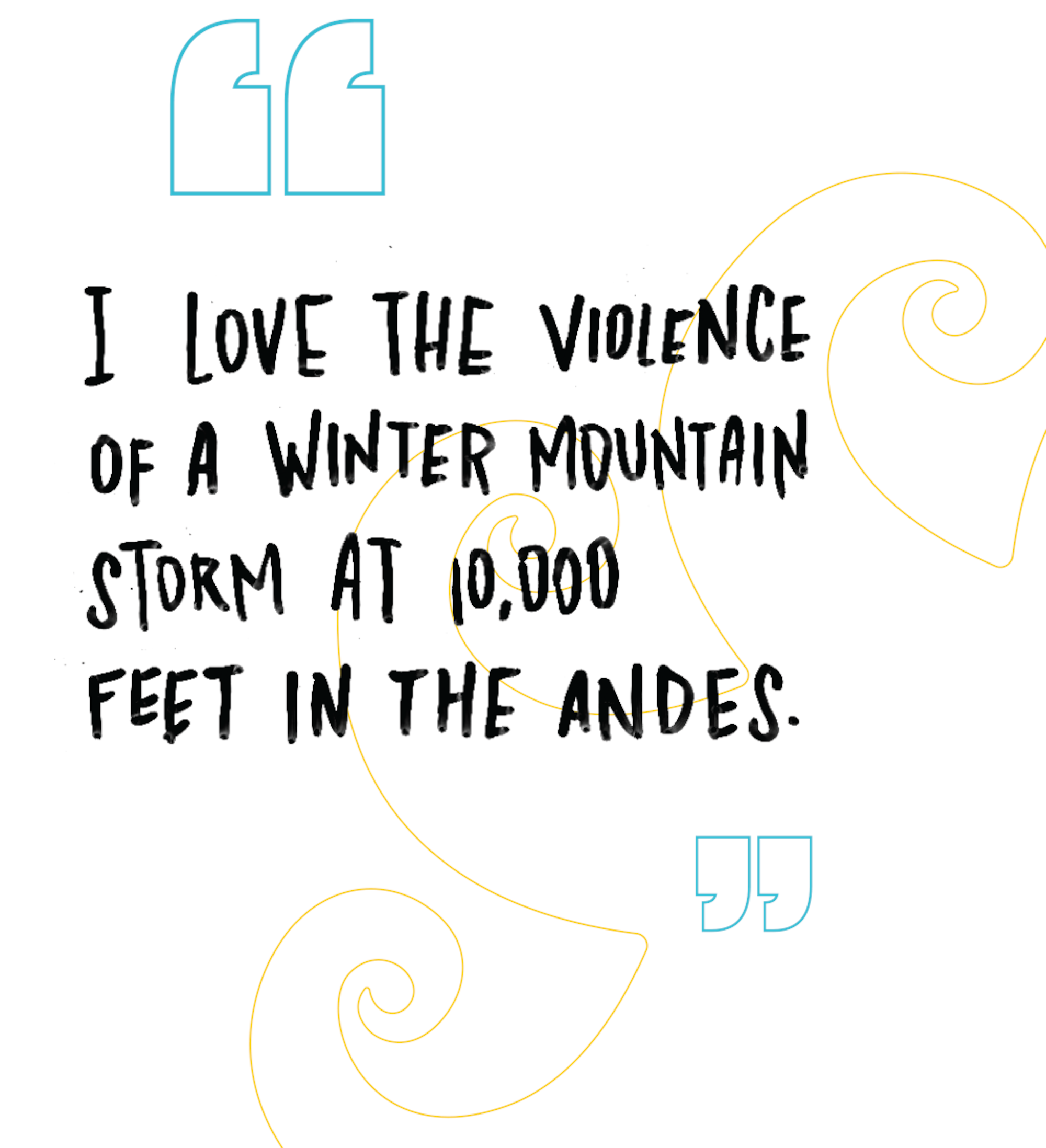 During my week, winter was transitioning to spring, and while there weren’t any window shattering storms, the sunsets were magical and the recrystallized powder on shady slopes was rippin’. With many of the popular runs tracked and firm, I scouted a line down valley from the infamous Super C Couloir. With a couple keen skiers, I set the bootpack up following a traverse out from the Roca Jack. Somewhere in the vicinity of the Ultima Quebrada, we hiked up towards the terminating cliffs above and found an amphitheater-like cirque that spilled into a chute, dumping us towards the mountain pass road switchbacks. At the bottom, tractor-trailers buzzed by us at vicious speeds as we unclicked from our skis. Gleaming and satisfied with our vision quest, we decided it was time for the hot tub.