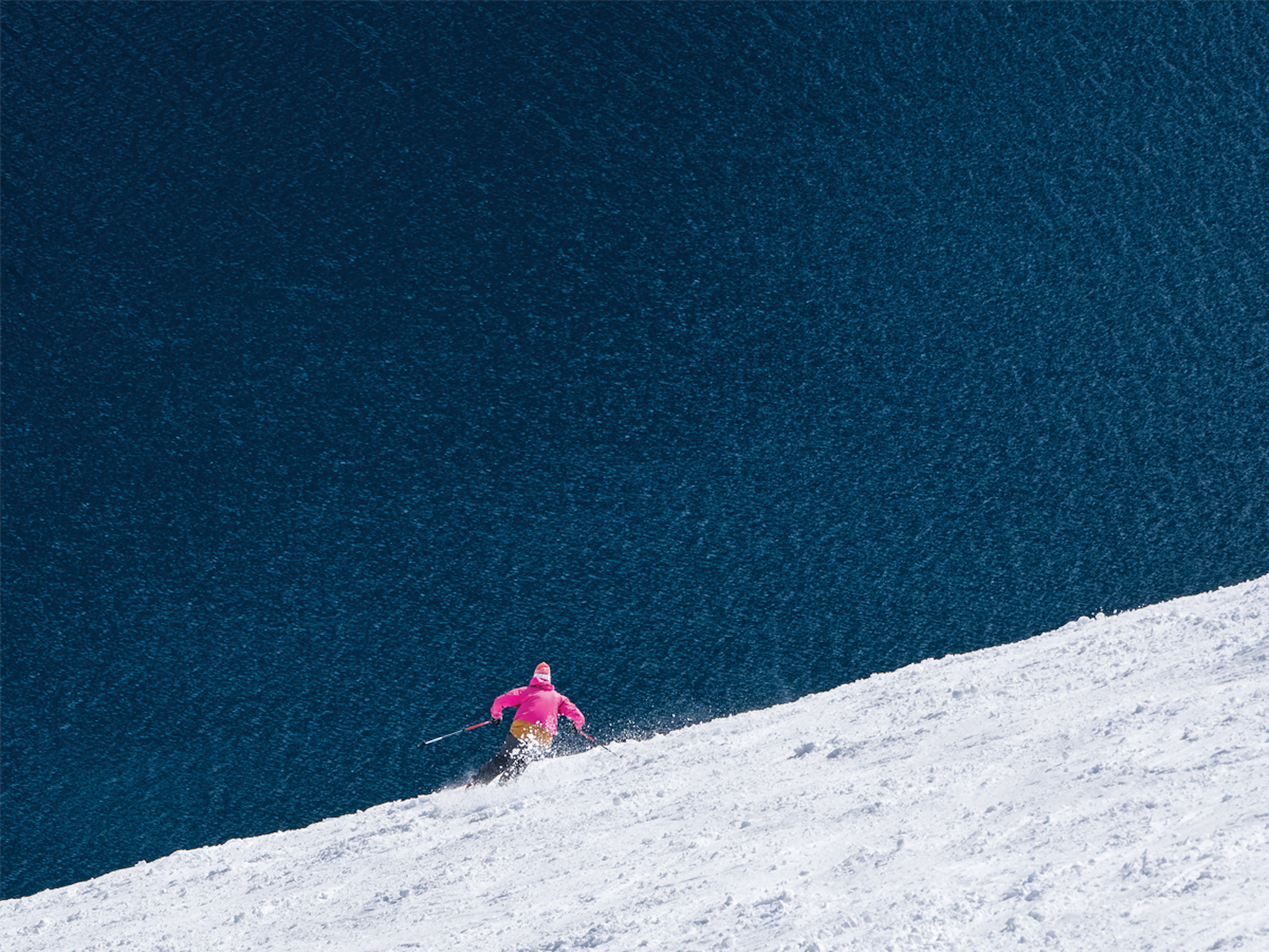 The deep, shimmering lake was in full view minutes after checking in. With the afternoon still ahead of us, our crew booted up under the bright, late-winter Chilean sun. It was a relatively dry winter in Portillo when we visited, but a storm blanketed the area the week prior to our arrival, and we quickly scooted for some laps on the iconic Lake Run. After a short traverse or bootpack, the Lake Run is accessed from the Condor lift. The Condor is a va et vient lifts (think four-pack rope tows ascending steep avalanche paths) that was designed specifically by Poma to match the steep terrain and withstand avalanches—eliminating chair lift towers that would inevitably be buried in the consequential terrain. With the trickiest part behind us, I quickly found my skiing legs, beelining it to the lake in awe of our surroundings with the mountains symmetrically reflecting their flanks into the water below.