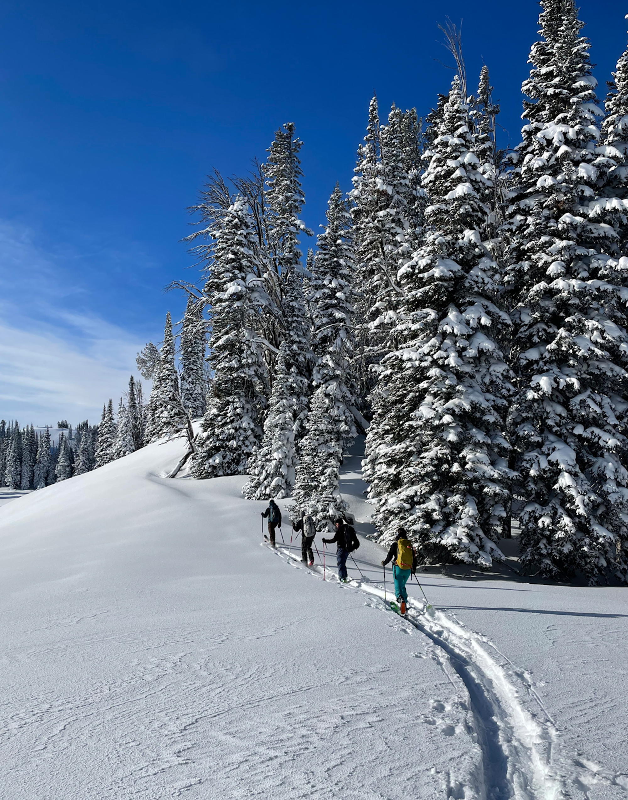 That’s why we’re here in the first place, right? If you’re breaking trail, try to stick to trees or ridges you likely won’t ski down and leave those wide-open pitches for the descent. No one wants their soul turns interrupted by the harsh clunk of the skintrack every few hundred yards.