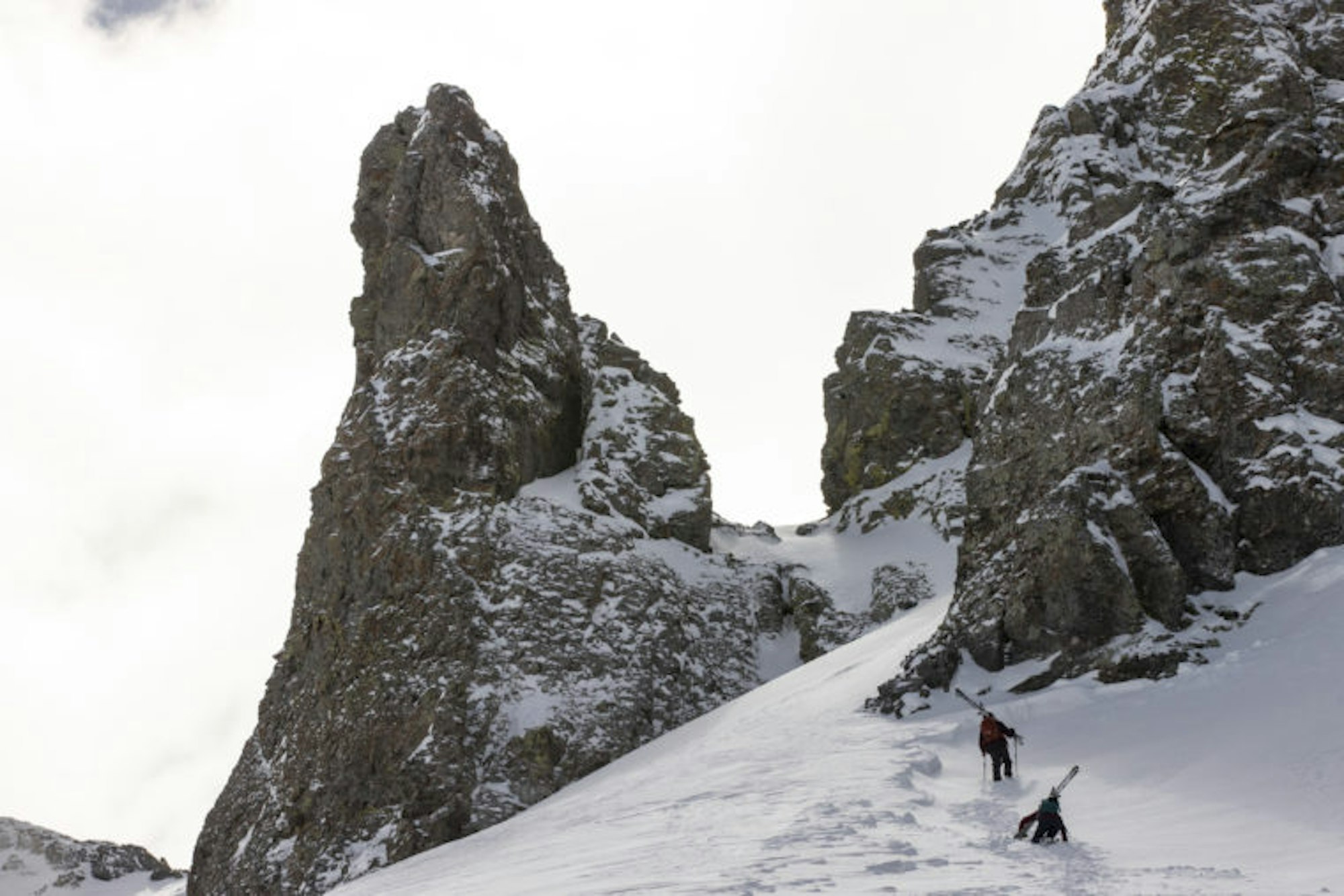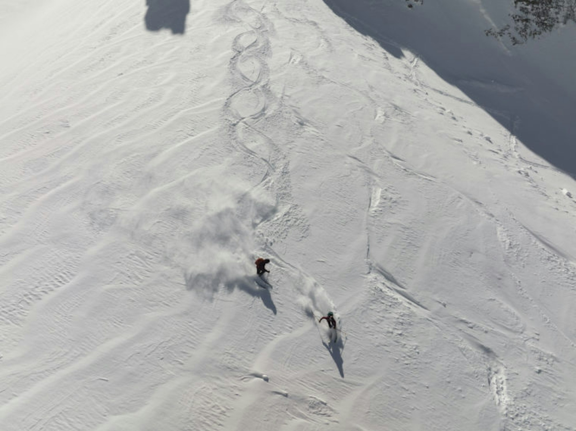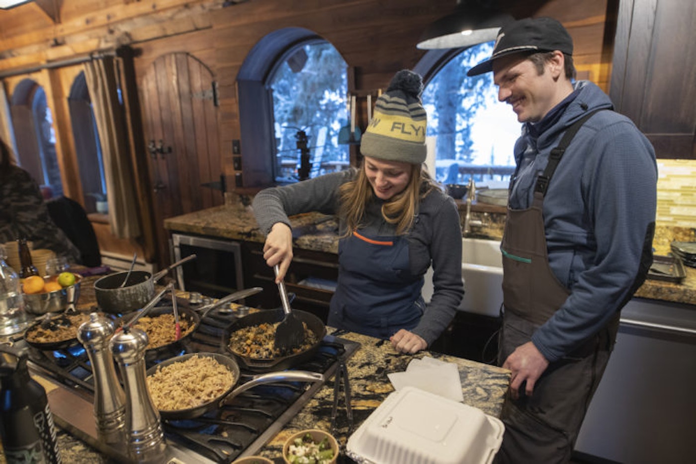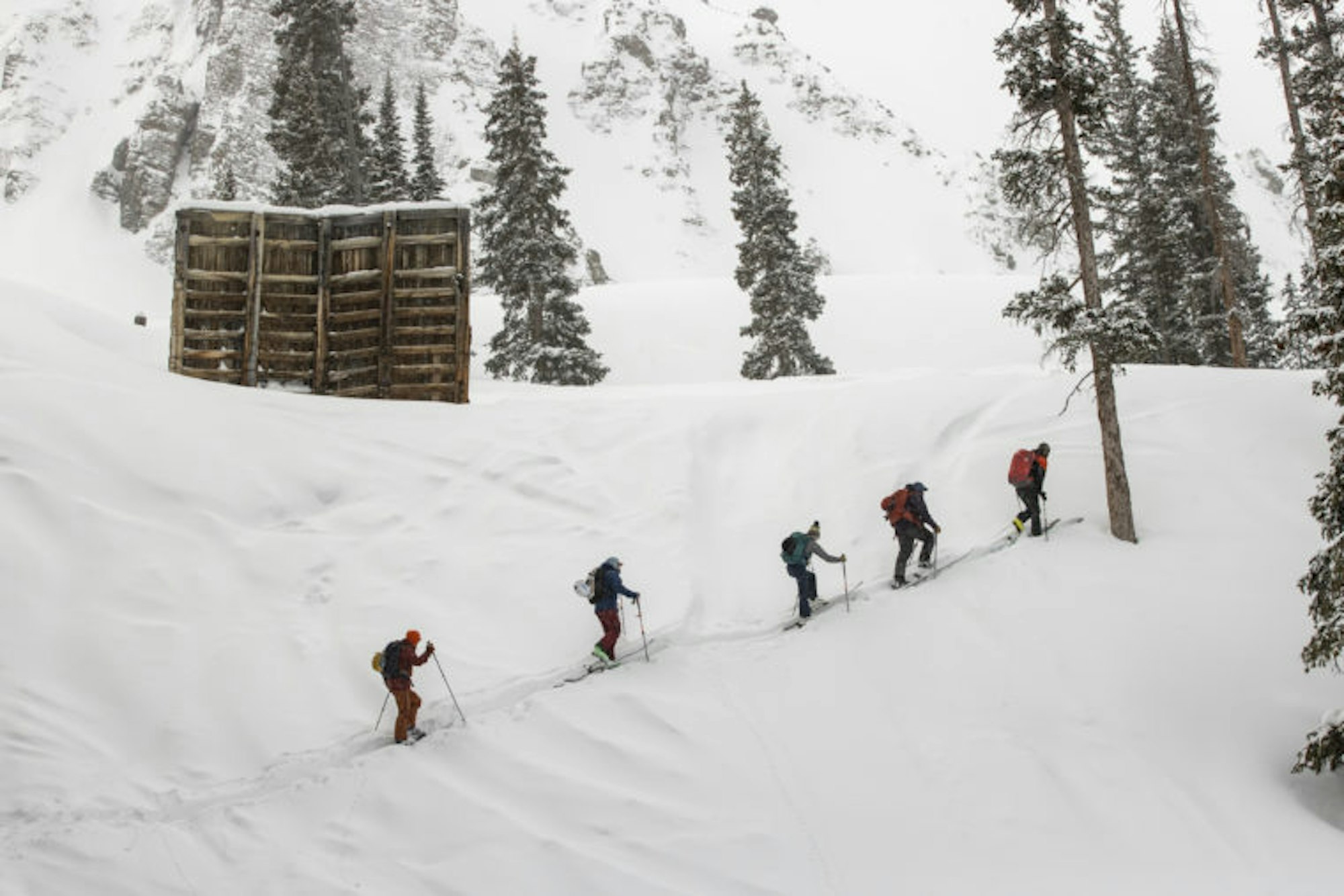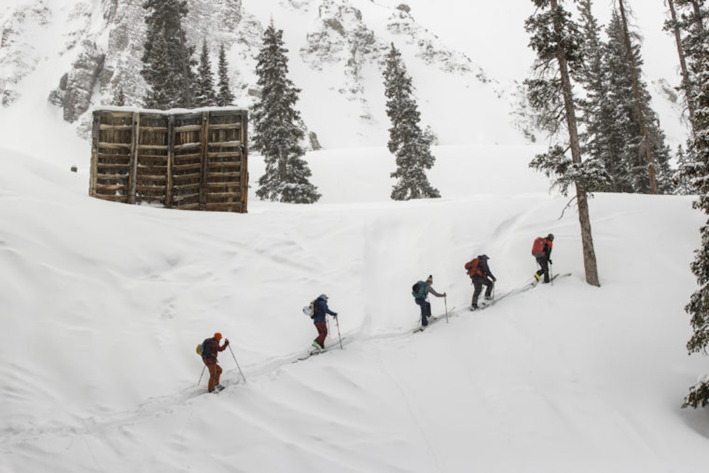 The first day, Curran and Hoeft were greeted with freshly groomed, steep corduroy. Skiing fast and firm fall-line groomers, the Unlimited’s ability to both lock into a turn and release with total ease gave Curran and Hoeft total confidence to slice and dice to their hearts’ content while also being able to relax enough and enjoy the incredible views of the historic mining town below. Come lunchtime, the two couldn’t resist making a stop at the on-mountain favorite, Giuseppe’s, for some grub. The second half of the day was chock-full of hot laps on the resort but instead of skiing back down to town at the end of the day, the couple grabbed their stashed packs and headed down the backside of Prospector Bowl into Alta Lakes Observatory.