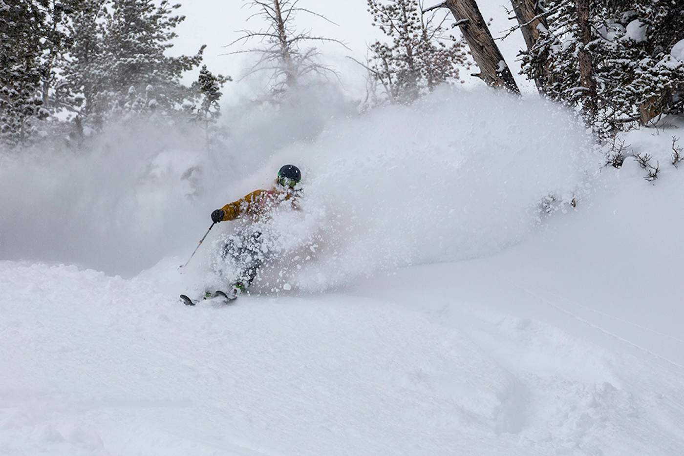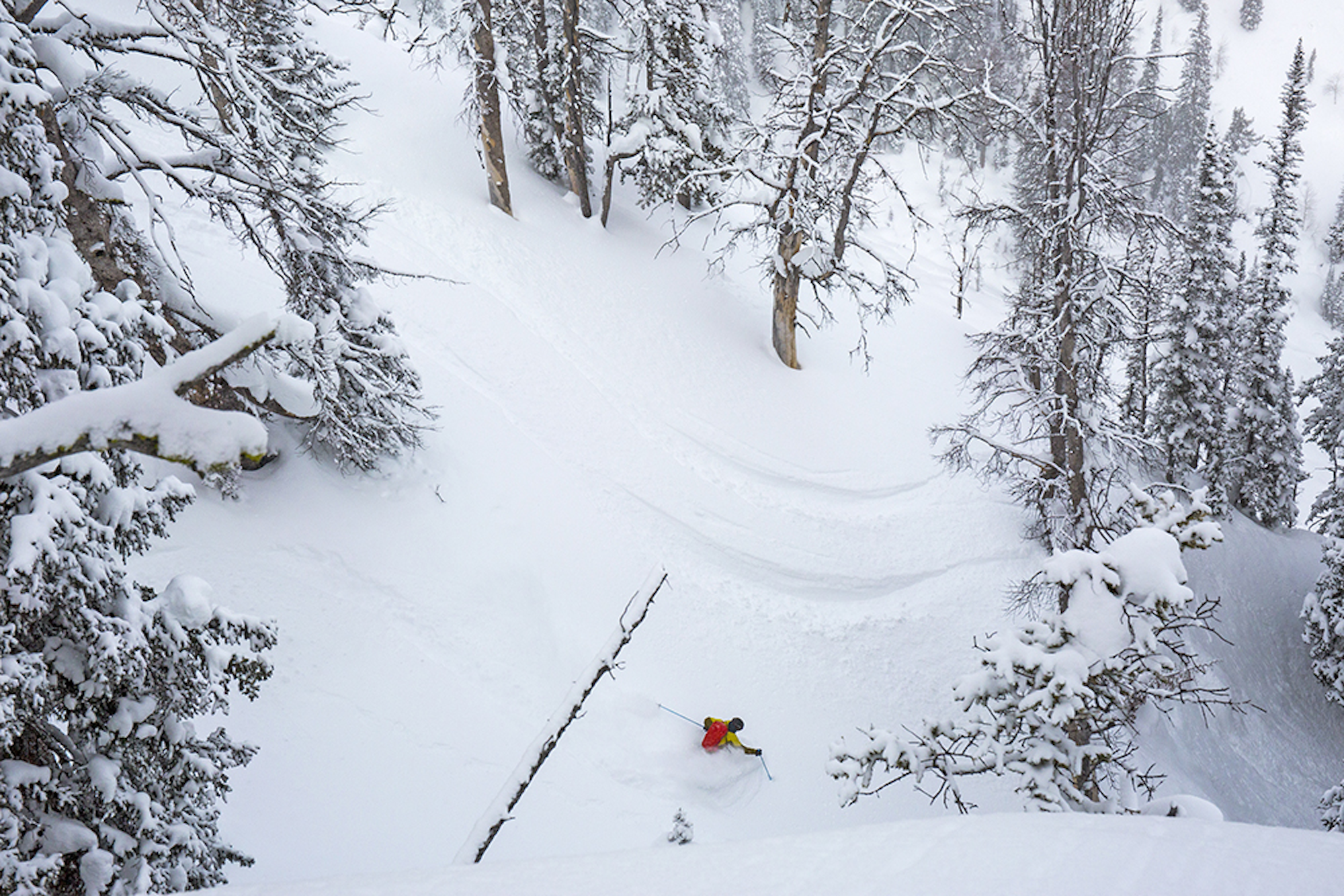 “He found the only flat landing in that entire pillow field,” Hoji ribs as I come to a stop before him and the four other members of our party. We’d just descended an incredible 1,000-foot line, beginning in the trees of a north-facing forest and ending in a wide-open ramp with a plethora of mushroom tops to pick apart, and all of it filled with over a foot of fresh Wyoming powder.