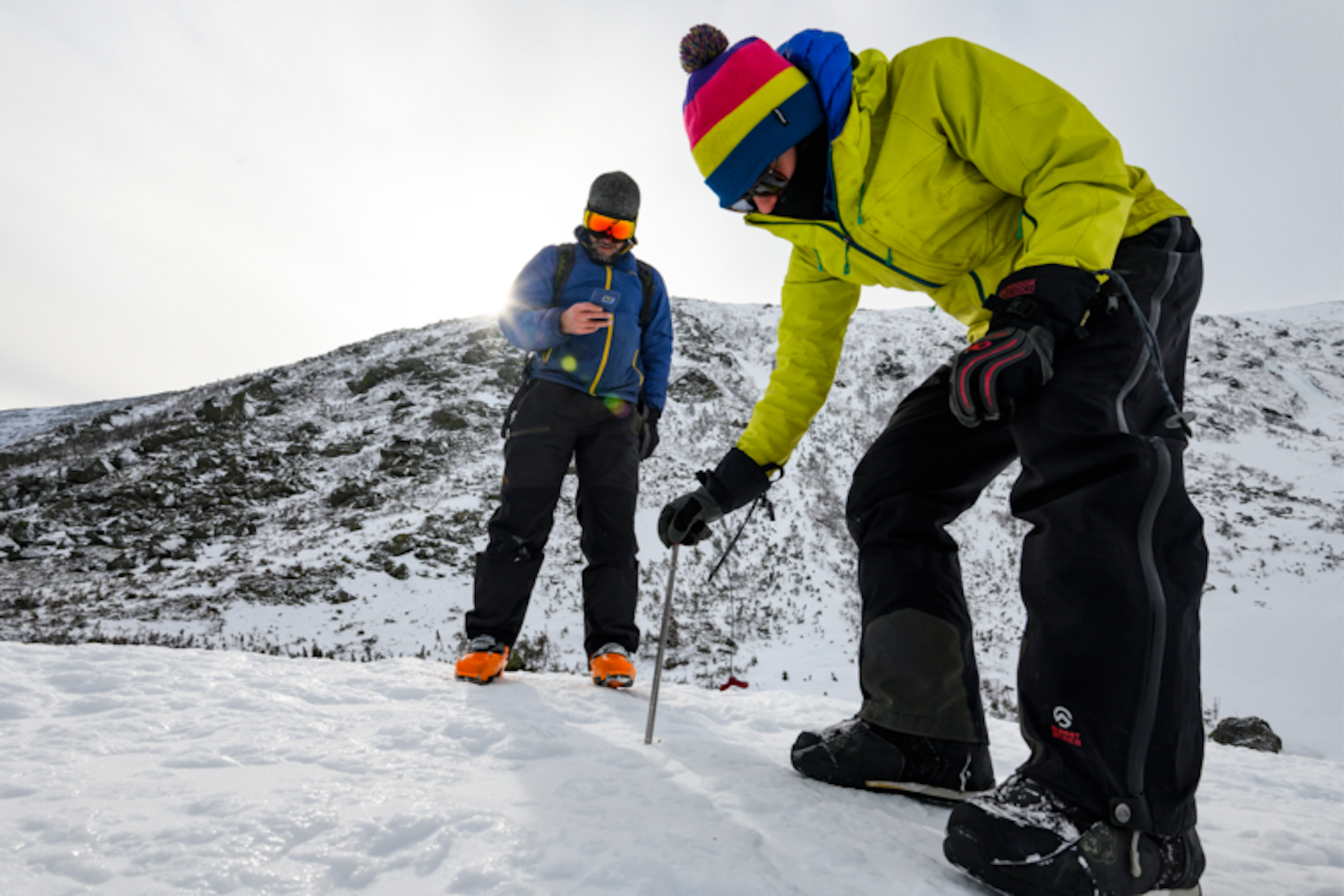 Elizabeth Burakowski measures snow depth in Tuckerman’s Ravine while Ryan Crumley checks the latest on Instagram. | PHOTO: Joe Klementovich