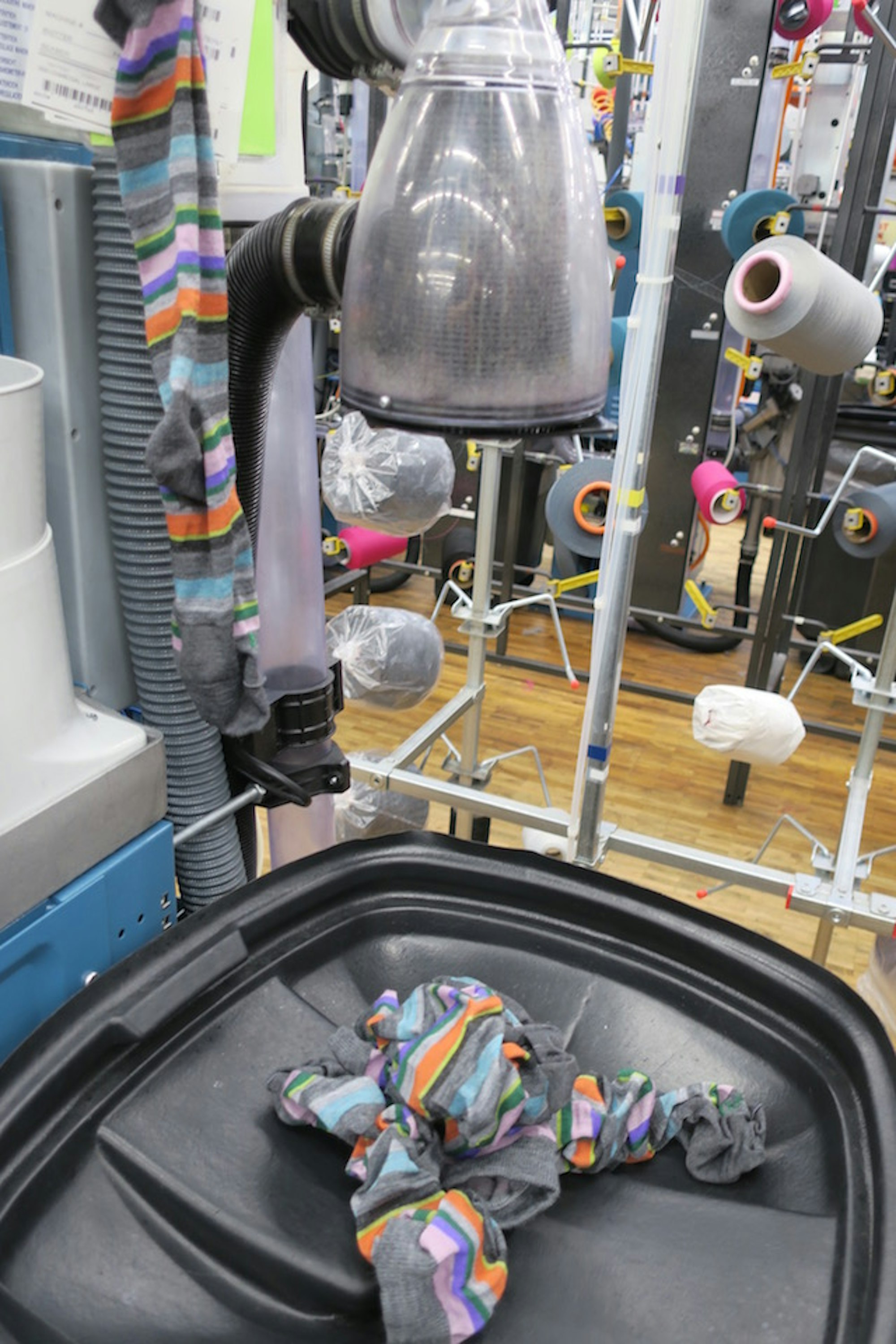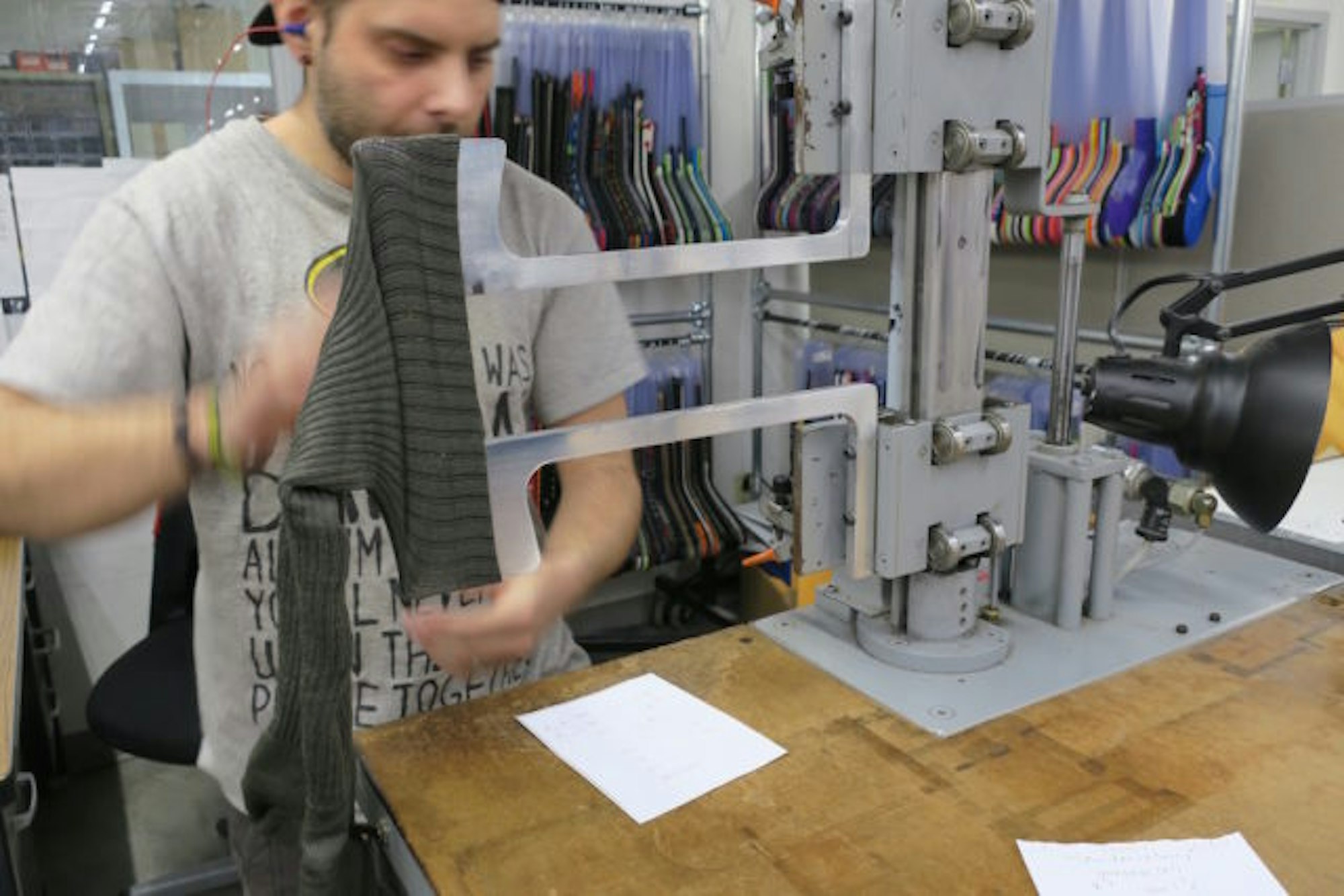 Following the knitting process, each sock is stretched out