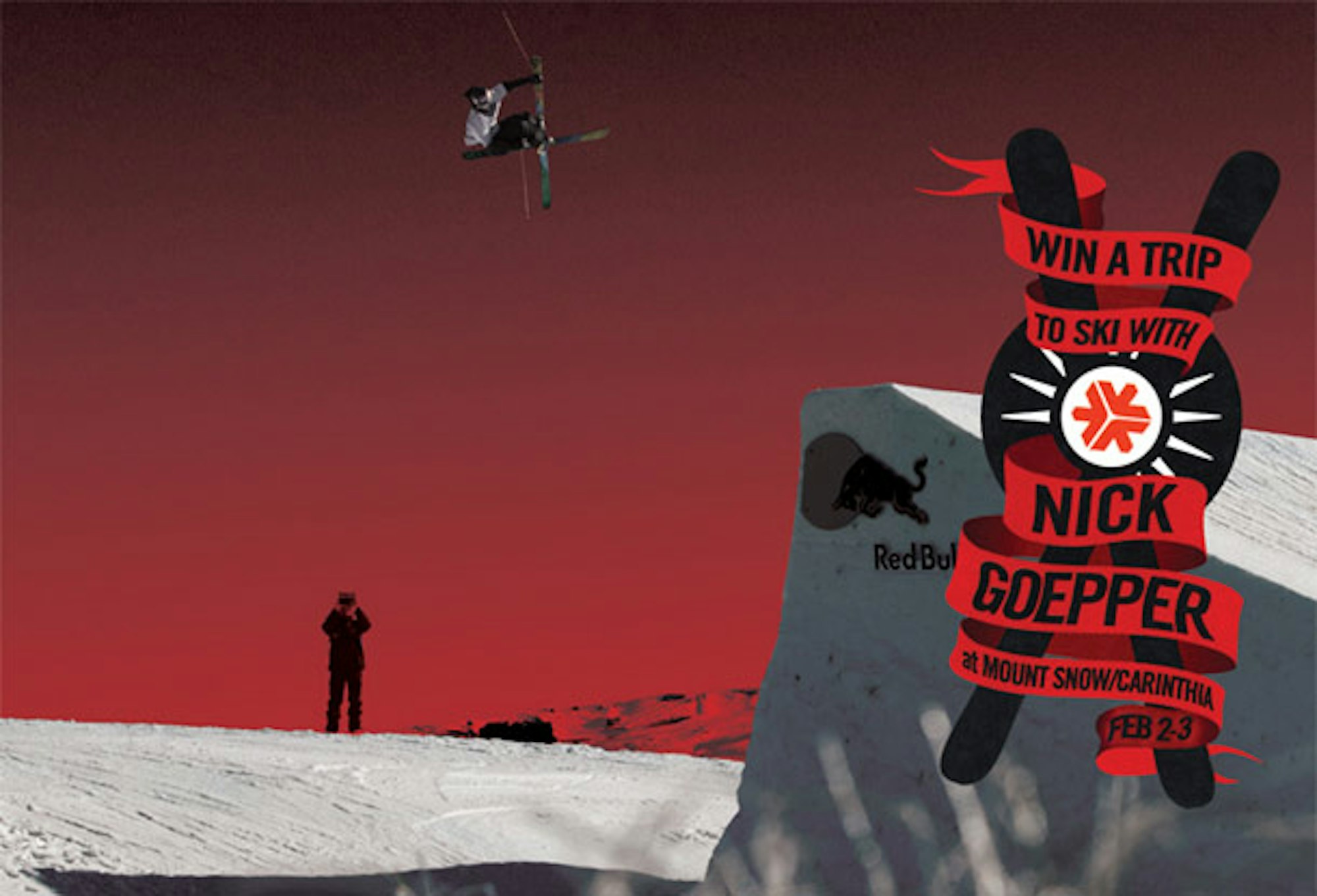 Mount Snow and Nick Goepper have teamed up on a sweet contest for park skiers. One lucky winner will receive two nights lodging at Mount Snow on February 1 and 2, two days lift tickets for up to four people at Mount Snow on February 2 and 3, a full day skiing with Nick Goepper on February 2 or 3 including tips on how to dominate one of the Eastās top parks, and a full setup from Nickās sponsors: Volkl skis, Marker bindings, Dalbello boots, Smith goggles plus Kicker headphones and an iPod docking system.