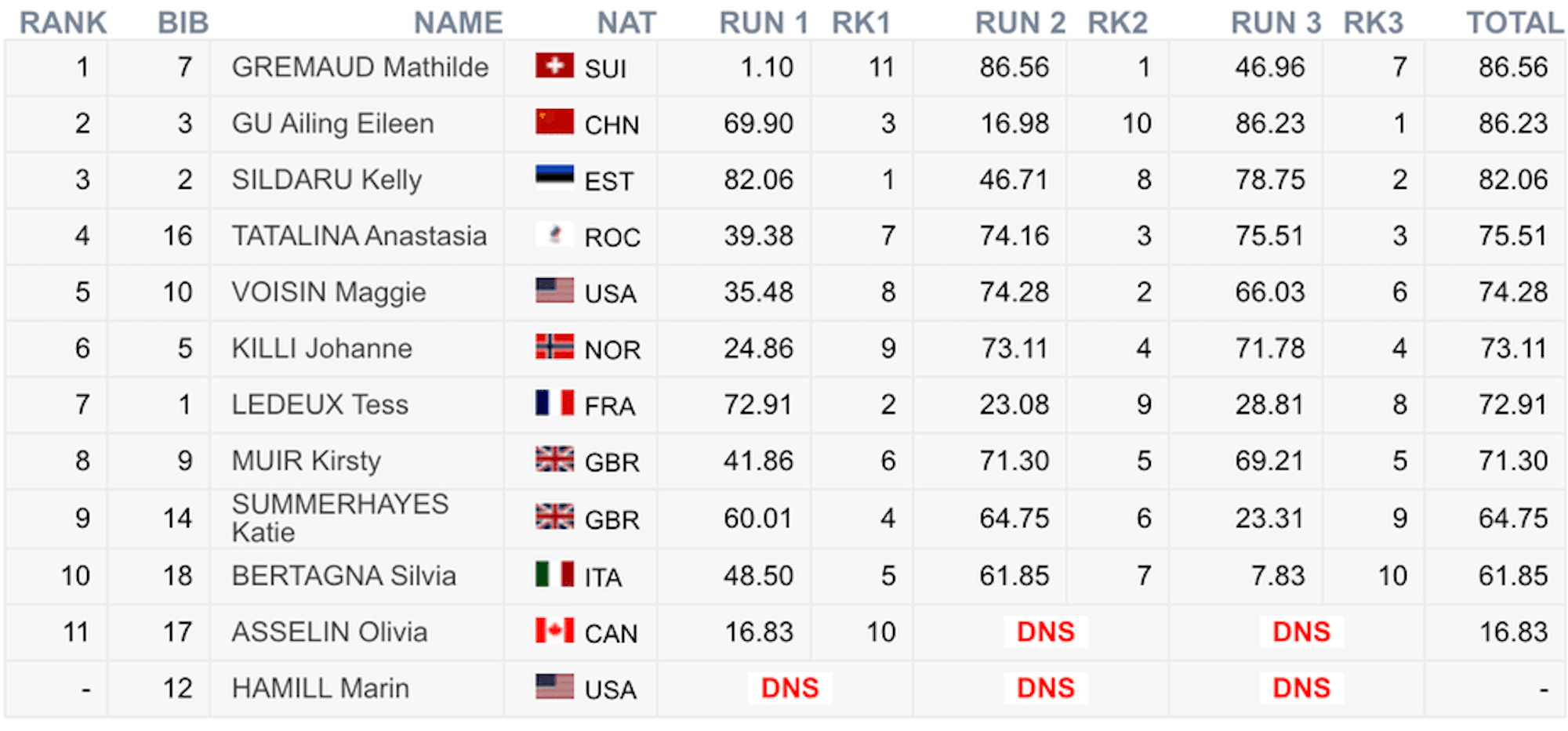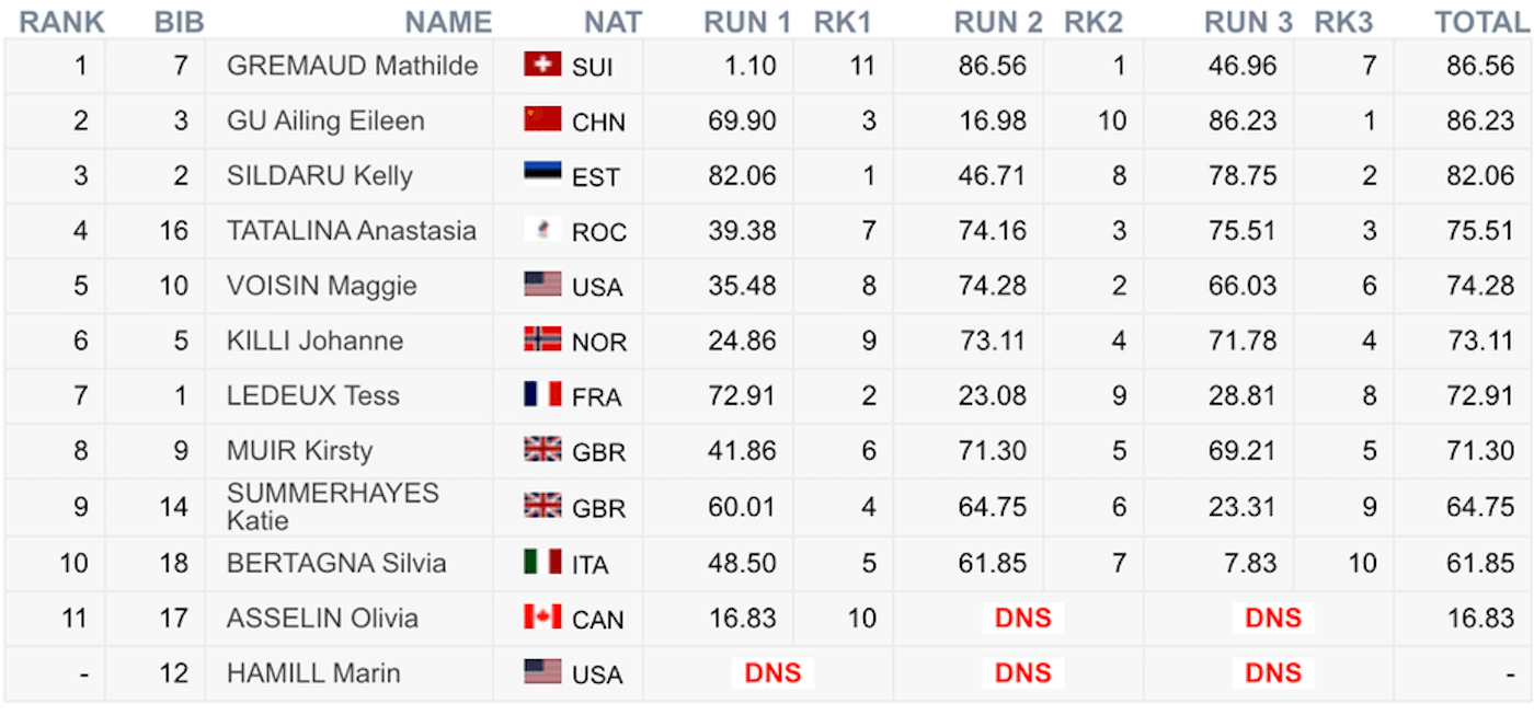 Eileen Gu, who has enough tricks in her bag to be a magician, was pushed to the limit following Gremaud’s runs—but even the 2021 World Champion couldn’t find a way to eke out a victory, finishing just 0.33 points behind the Swiss rider. And Kelly Sildaru, a top competitor in every event she rides and one of the favorites in the upcoming halfpipe comp, took the bronze. The medal was the first-ever Winter Olympics medal for her home country, Estonia.