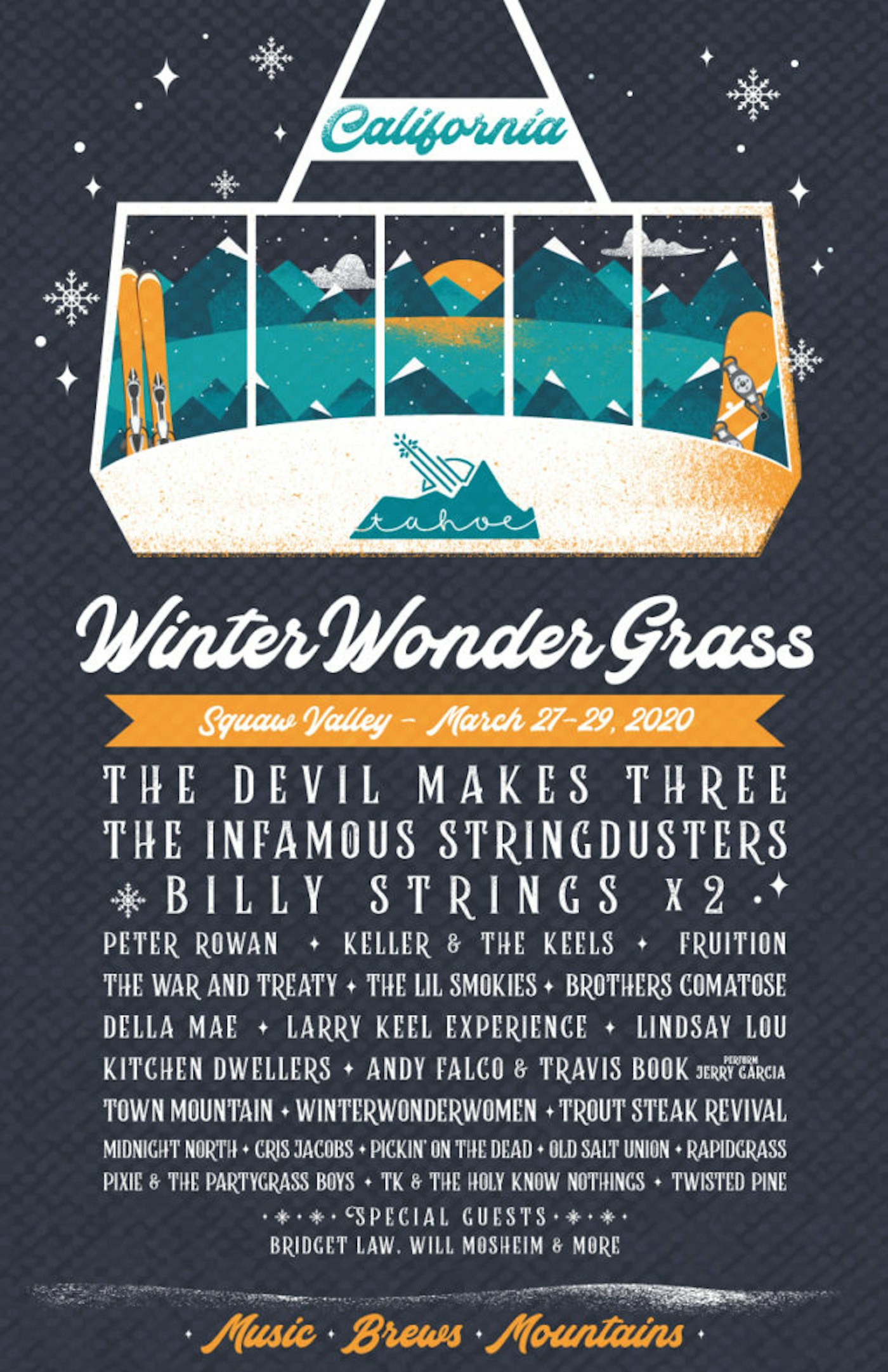 By 2015, WinterWonderGrass had migrated to a bigger space in Avon, Colorado, in the Vail Valley and Stoughton was toying with the idea of expanding. “I went out to look at sites in North Lake Tahoe just on a whim and I got to Squaw Valley and was like, ‘Wow there is an amazing energy here,’” Stoughton explains with palpable enthusiasm. “You stand in that valley looking at the mountain, feeling the river and knowing you’re close to the lake; there’s something so magical there.” It was a no-brainer for Stoughton to add Squaw Valley as the second stop on the WinterWonderGrass tour that year.