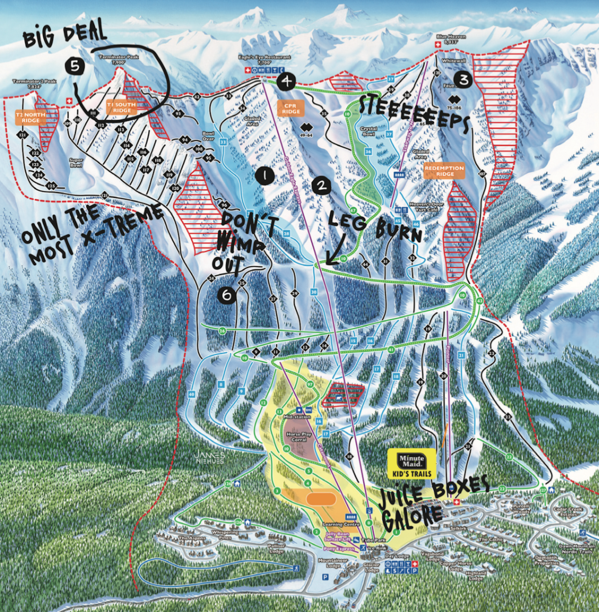 At this point, most first timers are already soaking in their hot tubs, relieving those muscles. Cap off the day at the top of Terminator 2, immersed in golden light, and gently launch on Crazy Legs. Spice it up with Wild Card or Unnecessary Roughness.